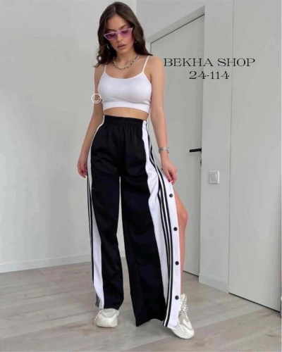 Стиль..показатьные широкие брюки с высоким боковым разрезом и кнопками — эффектная и комфортная модель для ярких образов.