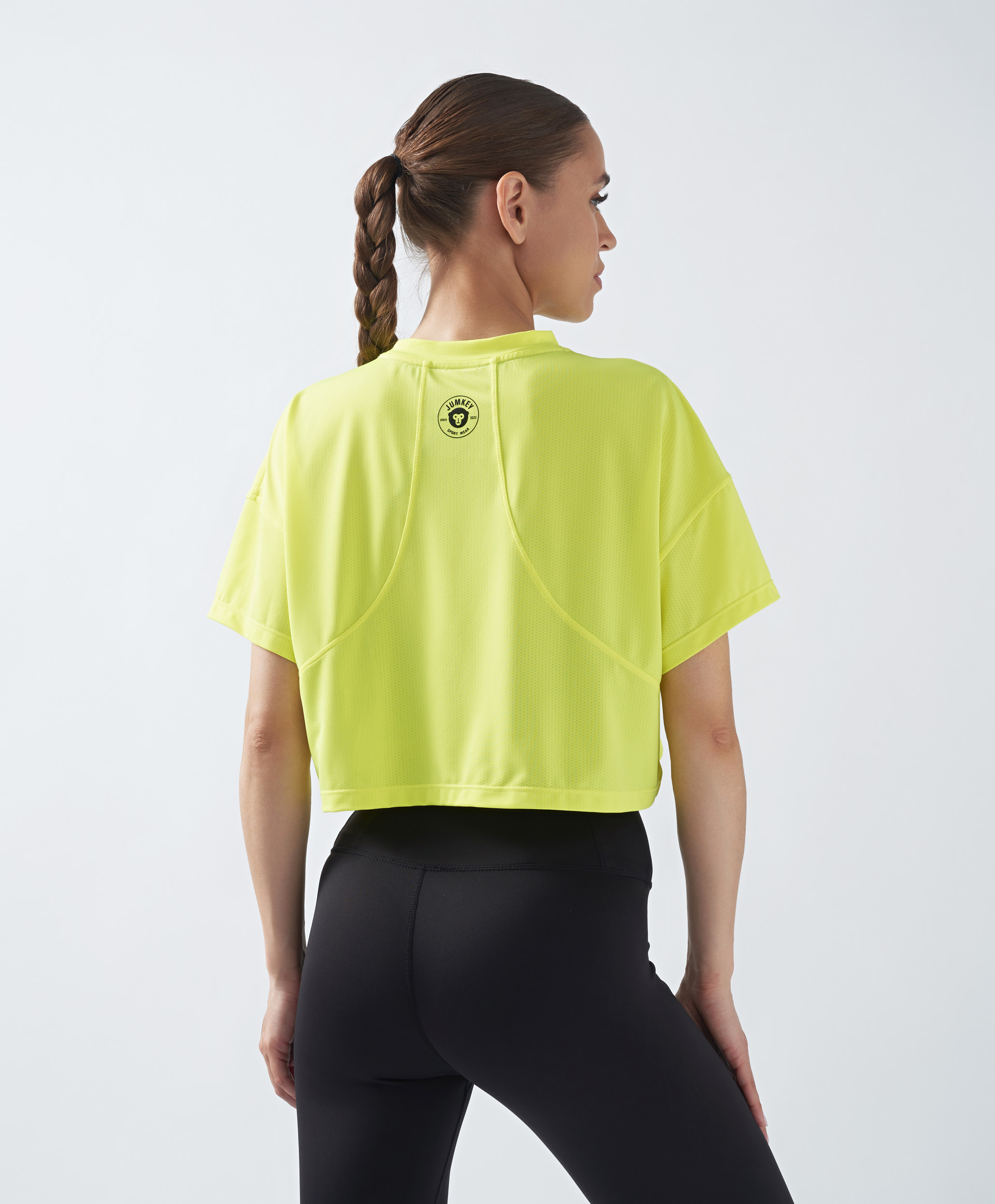 Свободный укороченный спортивный топ для женщины Jumkey выполнен в ярком салатовом цвете. Он автоматически заряжает на активность и хорошее настроение. Круглый вырез, короткие рукава, спущенная линия плеч дают максимальную свободу движений. Перфорация на ультратонкой и легкой трикотажной ткани выполнена для дополнительного воздухообмена, благодаря чему заниматься спортом в такой футболке комфортно и приятно. С широкой моделью можно составлять не только удобные, но и стильные образы, создавая многослойные луки. Укороченный топ комфортно сидит поверх маек, бюстье, лонгсливов и других предметов спортивного гардероба. Несмотря на броский цвет, комбинировать изделие с другой одеждой просто благодаря однотонности. Из дополнительных деталей - только логотип на спинке.