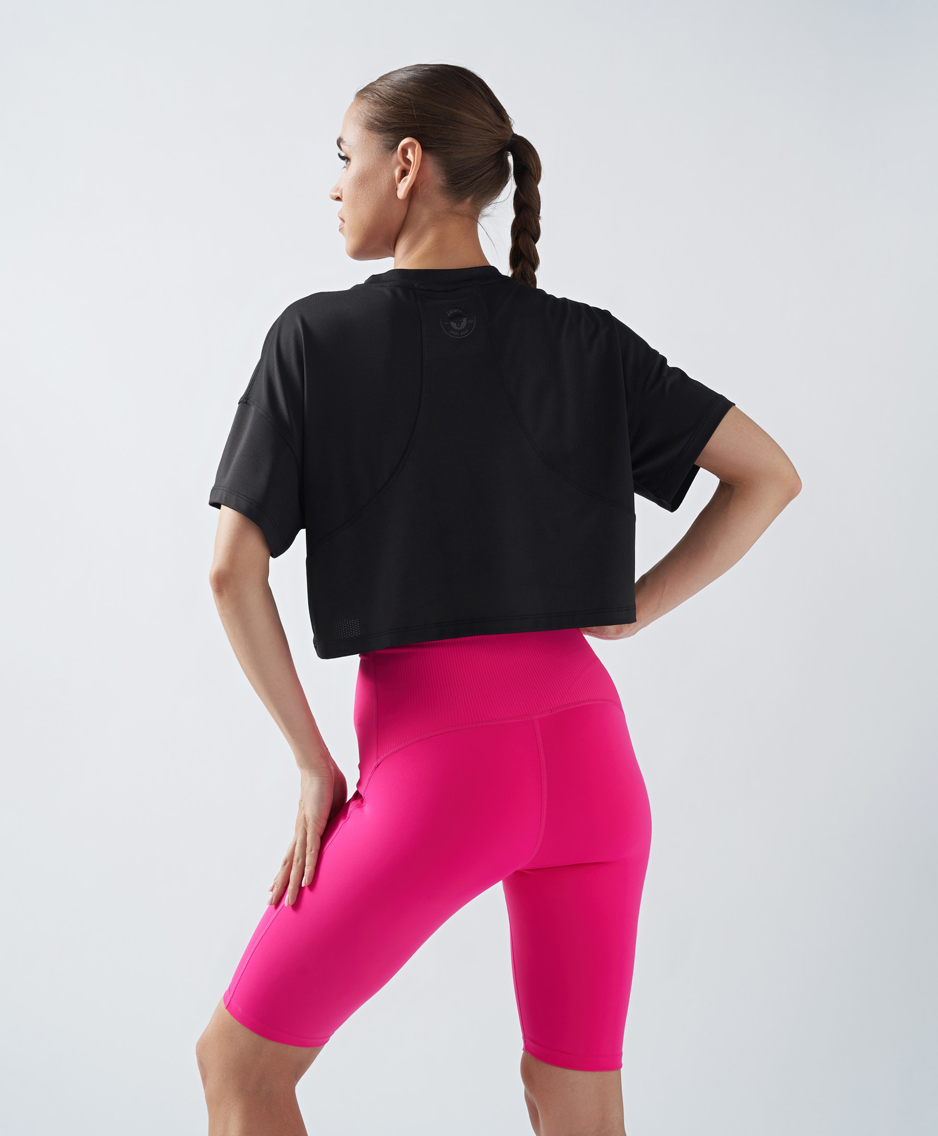 Свободный укороченный спортивный топ для женщины Jumkey выполнен в черном цвете. Круглый вырез, короткие рукава, спущенная линия плеч дают максимальную свободу движений. Перфорация на ультратонкой и легкой трикотажной ткани выполнена для дополнительного воздухообмена, благодаря чему заниматься спортом в такой футболке комфортно и приятно. С широкой моделью можно составлять не только удобные, но и стильные образы, создавая многослойные луки. Укороченный топ комфортно сидит поверх маек, бюстье, лонгсливов и других предметов спортивного гардероба. Изделие легко комбинировать с другой одеждой благодаря однотонности и классическому цвету. Из дополнительных деталей - только логотип на спинке.