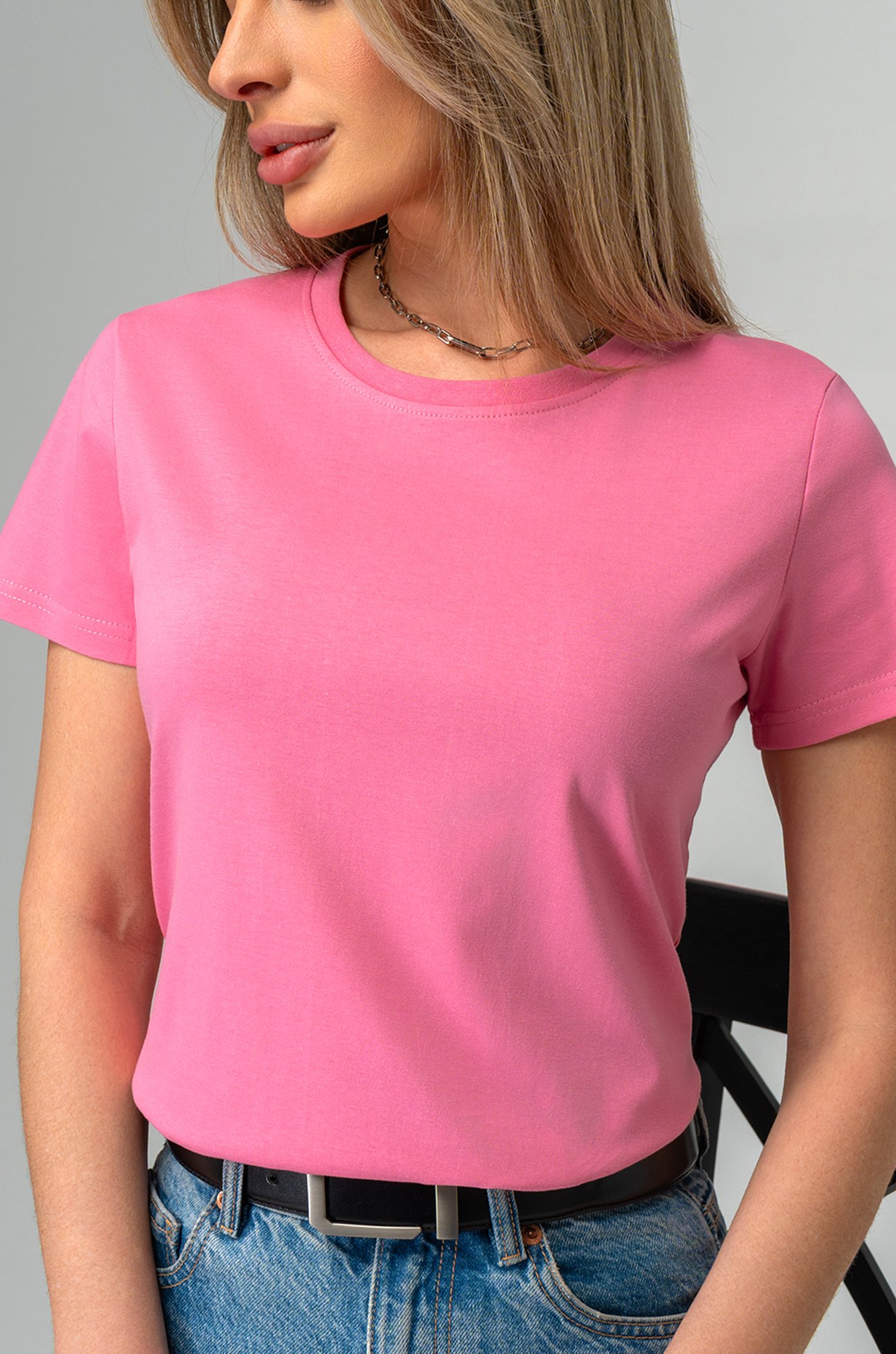 Женская базовая футболка станет незаменимой частью капсульного гардероба. Классическая футболка выполнена из 100% хлопка. Розовая футболка — идеальный выбор для тех, кто ценит стиль, комфорт и простоту в каждой детали. Однотонная футболка — прекрасная база на лето.