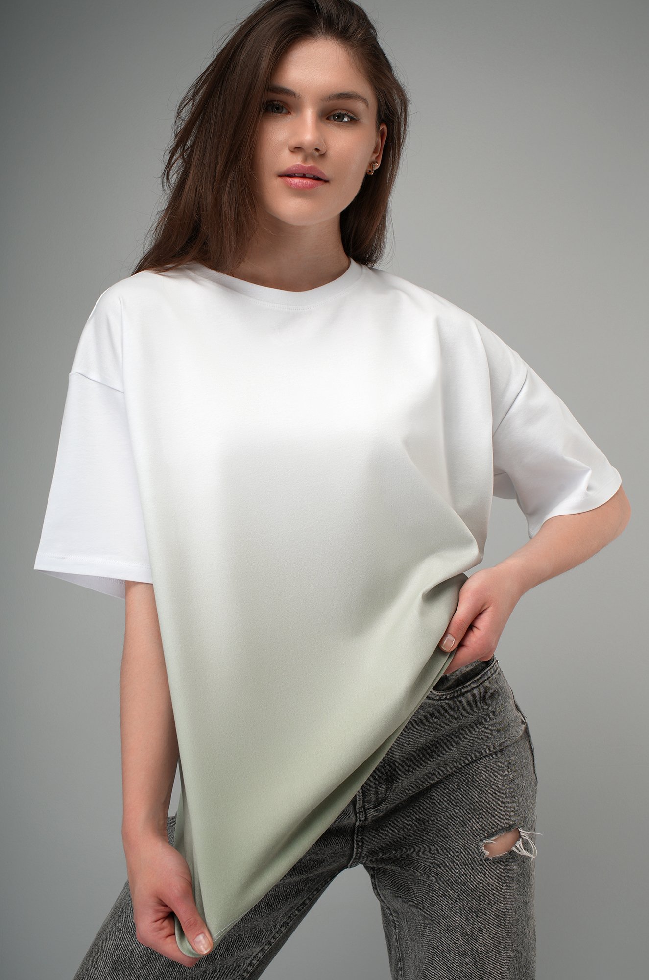 Женская футболка с градиентным принтом выполнена из хлопка с добавлением лайкры. Футболка с нежным эффектом омбре идеальна для создания стильных и расслабленных образов. Плавный переход от серого к зеленому добавляет свежести и легкости.