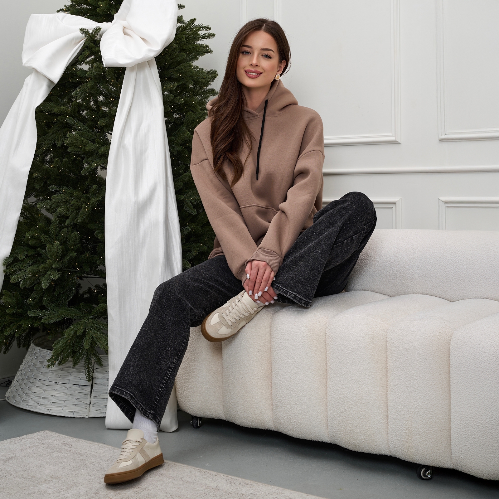 бежевый Женская базовая худи с капюшоном и карманом кенгуру.Материал: