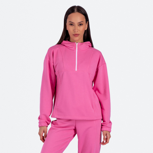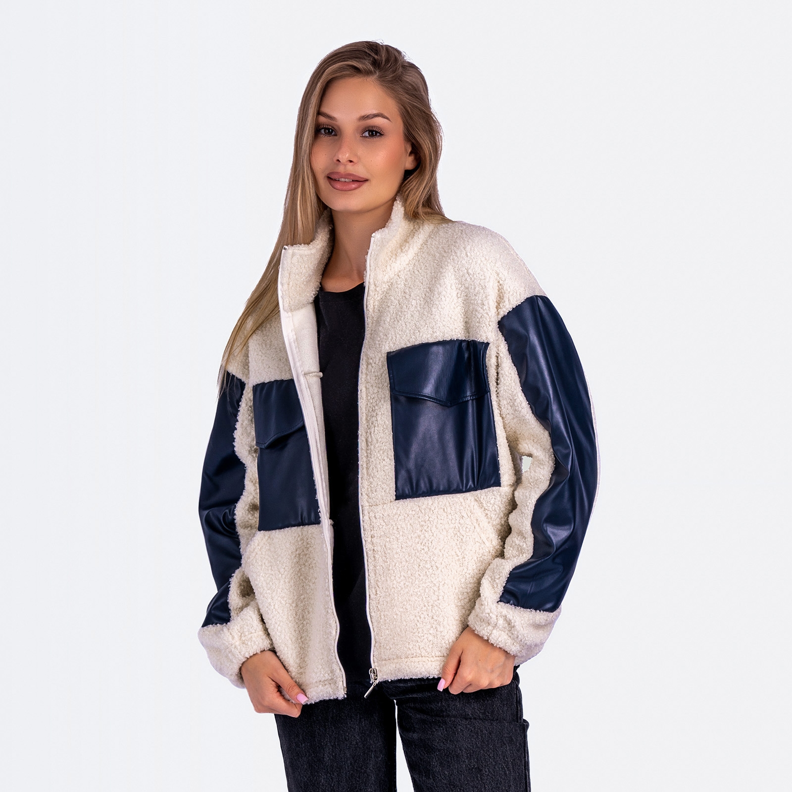 Женская куртка-толстовка на молнии, воротник-стойка, с карманами с клапанами на уровне груди.
