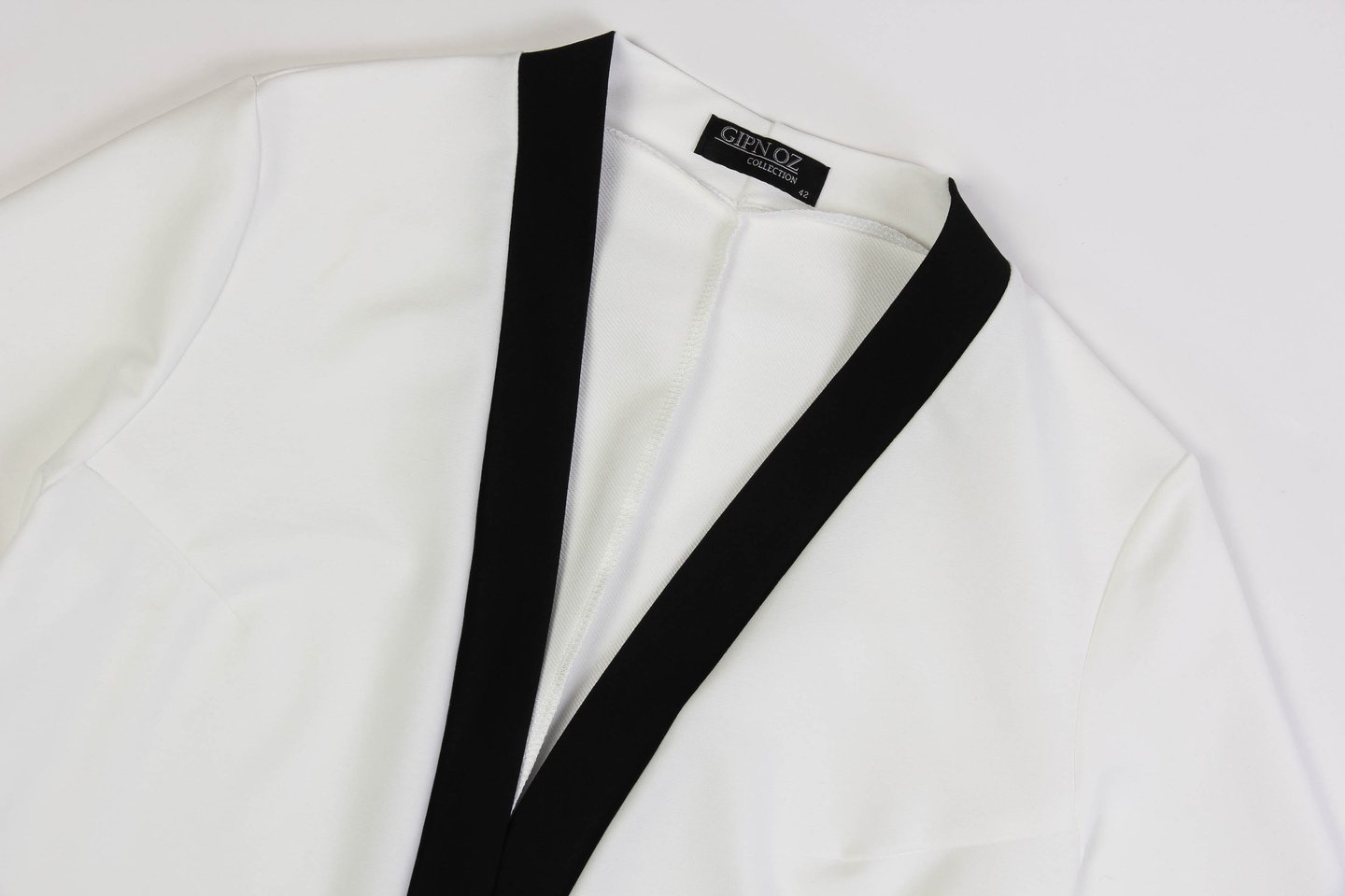 Уютный трикотажный костюм. Свободный жакет без застежки, по борту контрастная планка, подвязан поясом.