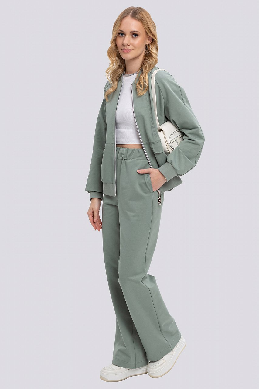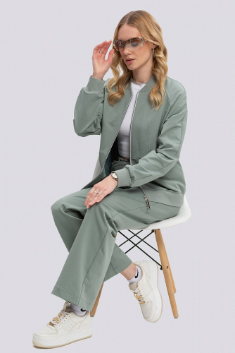 бомбер на молнии стала настолько универсальной, что женщины с большим удовольствием носят ее круглогодично. Карманы с клапаном, покрой рукава – реглан. Широкие брюки