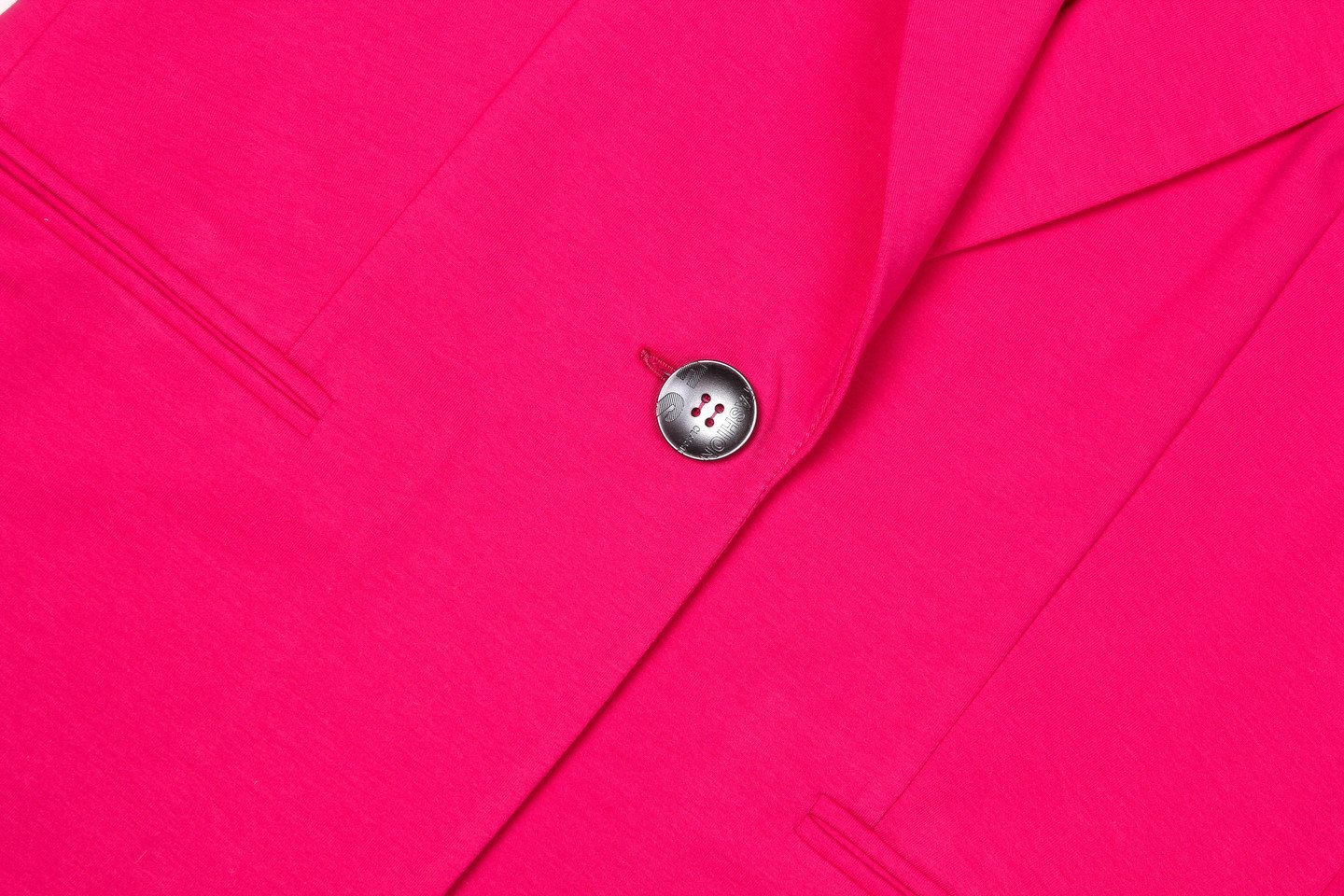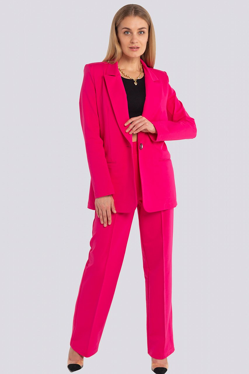 Классический костюм всегда был в моде, такие костюмы подходят всем, независимо от фигуры. Их можно носить с блузками, рубашками, для того, чтобы создать строгий образ. Для повседневного ношения можно надеть свитер или топ. Современные женщины готовы носить модный костюм с брюками по любому поводу и это правильно. Более того, женский брючный костюм входит в топ вещей, без которых представить себе актуальный женский гардероб в сезоне 2023-2024 будет немыслимо. Жакет с воротником английского типа, свободного объема, полуприлегающего силуэта. Застежка на пуговицу, элегантные карманы в рамку. Брюки широкие, стрелка застрочена, со шлевками, пояс частично с резинкой. Посадка брюк – высокая, на талии. В очередной раз пришла в моду палитра сочных оттенков – фуксия, ярко-синий, зеленая мята – наш выбор. Модель представлена из трикотажной ткани, что предоставляет максимум комфорта в носке. Ткань не мнется, не вытягивается и не выгорает.