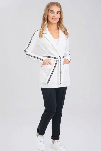 Стильный женский костюм с брюками и жакетом обязательно оценят модницы. Брюки с высокой посадкой застроченными стрелками. В поясе резинка. Карманы с отрезным бочком на брюках. По низу можно подвернуть манжету. Жакет свободного кроя с воротником пиджачного типа. Талию можно подчеркнуть модным поясом с принтом. В этом костюме вы можете пойти и в школу , в офис и на прогулку с друзьями.. Удобные большие накладные карманы. Застежка на пуговицу. Состав трикотажа: 75% хлопок, 20% полиэстер, 5% спандекс.