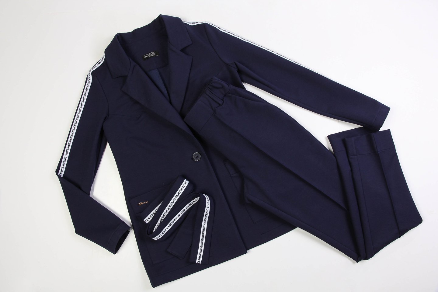 Стильный женский костюм с брюками и жакетом обязательно оценят модницы. Брюки с высокой посадкой застроченными стрелками. В поясе резинка. Карманы с отрезным бочком на брюках. По низу можно подвернуть манжету. Жакет свободного кроя с воротником пиджачного типа. Талию можно подчеркнуть модным поясом с принтом. В этом костюме вы можете пойти и в школу , в офис и на прогулку с друзьями.. Удобные большие накладные карманы. Застежка на пуговицу. Состав трикотажа: 75% хлопок, 20% полиэстер, 5% спандекс.