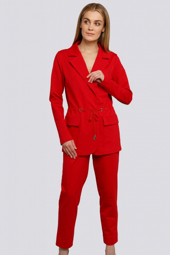 Использование современных брючных костюмов позволяет визуально улучшить фигуру и усилить восприятие стройности. В таком наряде каждая дама сможет подчеркнуть сильные стороны своего телосложения и спрятать недостатки. Стильный брючный трикотажный костюм – отличный вариант деловой одежды. Он придает женщине стройности и добавляют женственность и привлекательность внешнему облику. Жакет свободного кроя с воротником пиджачного типа. Талия подчеркнута кулисой с тесьмой. Застежка на потайную кнопку. Брюки с высокой посадкой и складками на талии. Пояс на резинке. По низу брюк можно отвернуть манжеты. Состав трикотажа: 75% хлопок, 20% полиэстер, 5% спандекс.