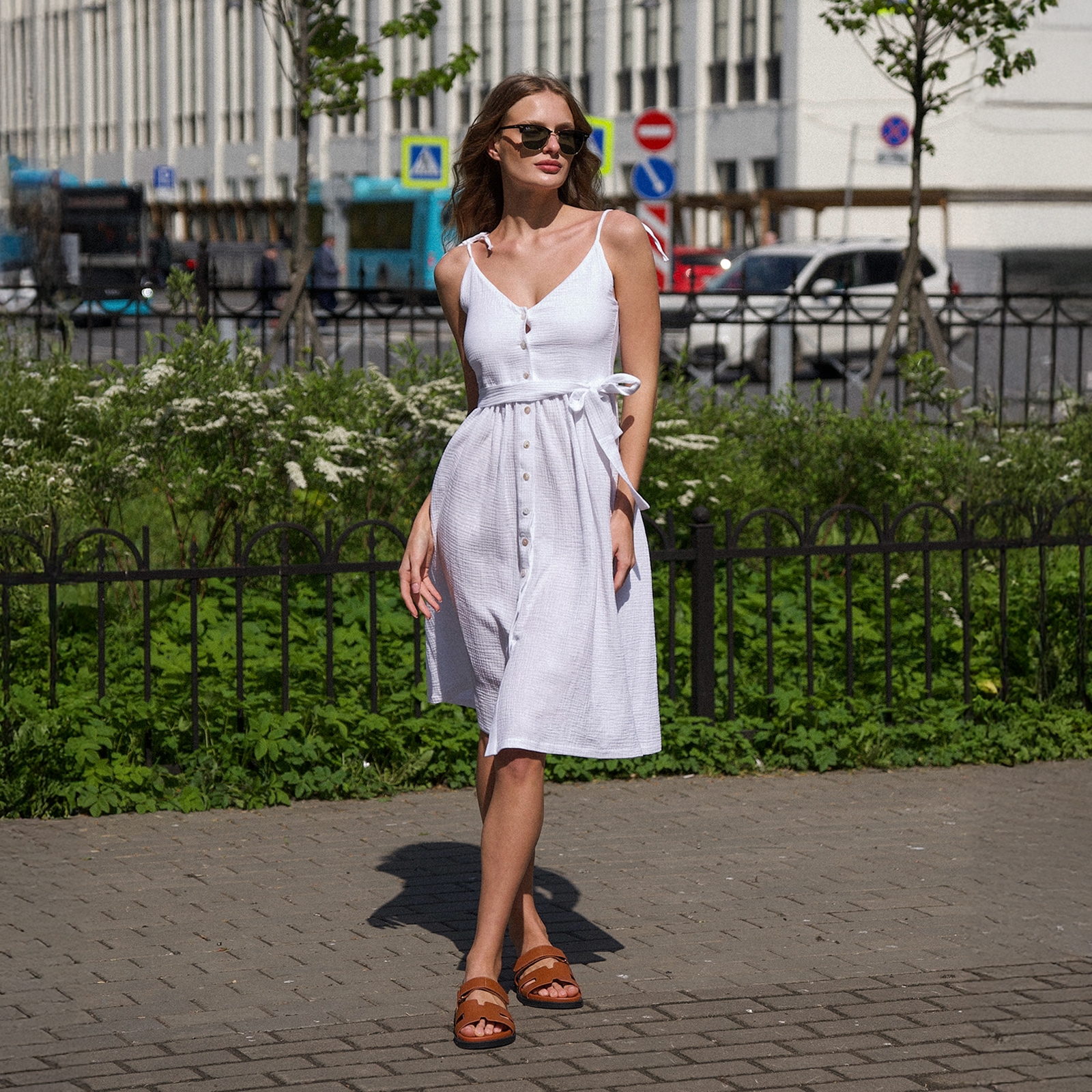 белый Женский сарафан на бретелях, с центральной застежкой на пуговицы.Материал: