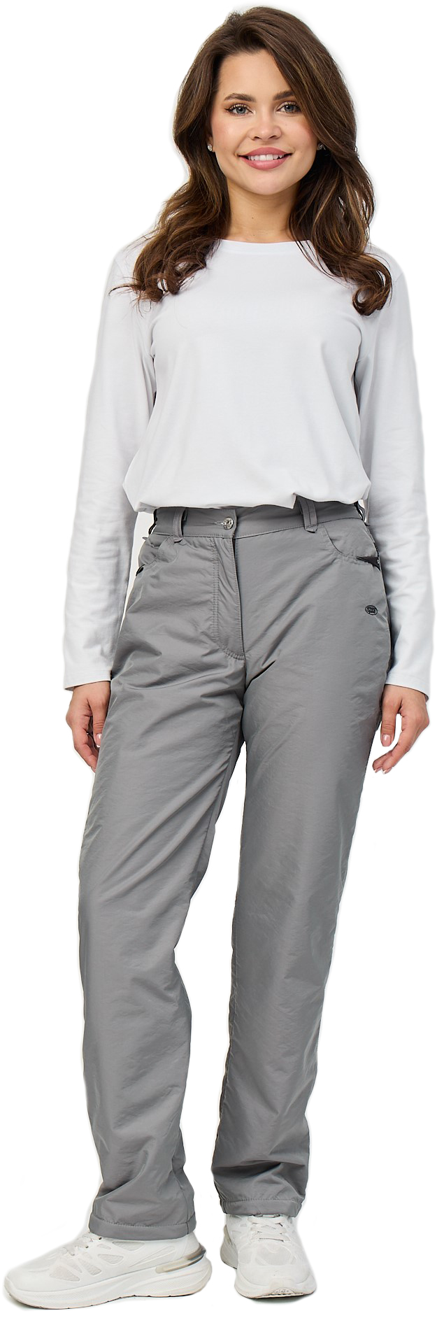 Зимние женские брюки с гульфиком на молнии. Пояс полужёсткий с резинкой сзади. Фиксируется пуговицей. Шлёвки двойные усилены по краям закрепками. Посадка высокая, комфортная. Брючины немного заужены книзу. Передние карманы открытые полукруглые, отделаны изнутри и сбоку светло-серым материалом и дополнены хольнитенами со стразами. Сзади кокетка, под которой расположены декоративные вставки треугольной формы. Под левым карманом вышивка в фирменном стиле, выполненная серебряными нитками. Две размерные группы.