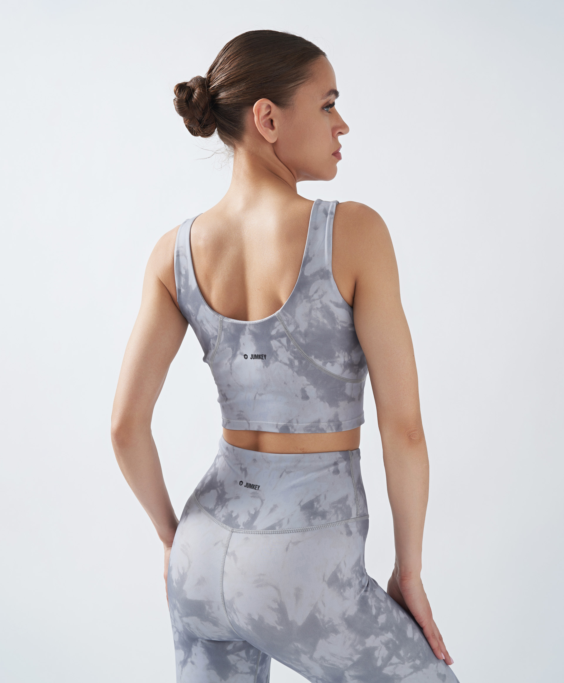Спортивный серый топ с мягкими чашками для женщины Jumkey. Ультрамягкая модель с легкой поддержкой из бифлекса сделает тренировки не только полезными, но и максимально комфортными. Нейлон в составе сделает топ устойчивым к частой носке, а эластан - оптимально растяжимым. Спереди имеется V-образный мягкий вырез, сзади - круглый глубокий вырез. Плоские швы не ощущаются на теле, а гладкая ткань обеспечивает тактильно приятные ощущения. Мягкие съемные чашки можно достать при желании. А вшитый внутренний топ на резинке обеспечит комфортное прилегание и зафиксирует изделие на теле. Модель с принтом тай-дай и неброским логотипом легко сочетать с другой спортивной одеждой.