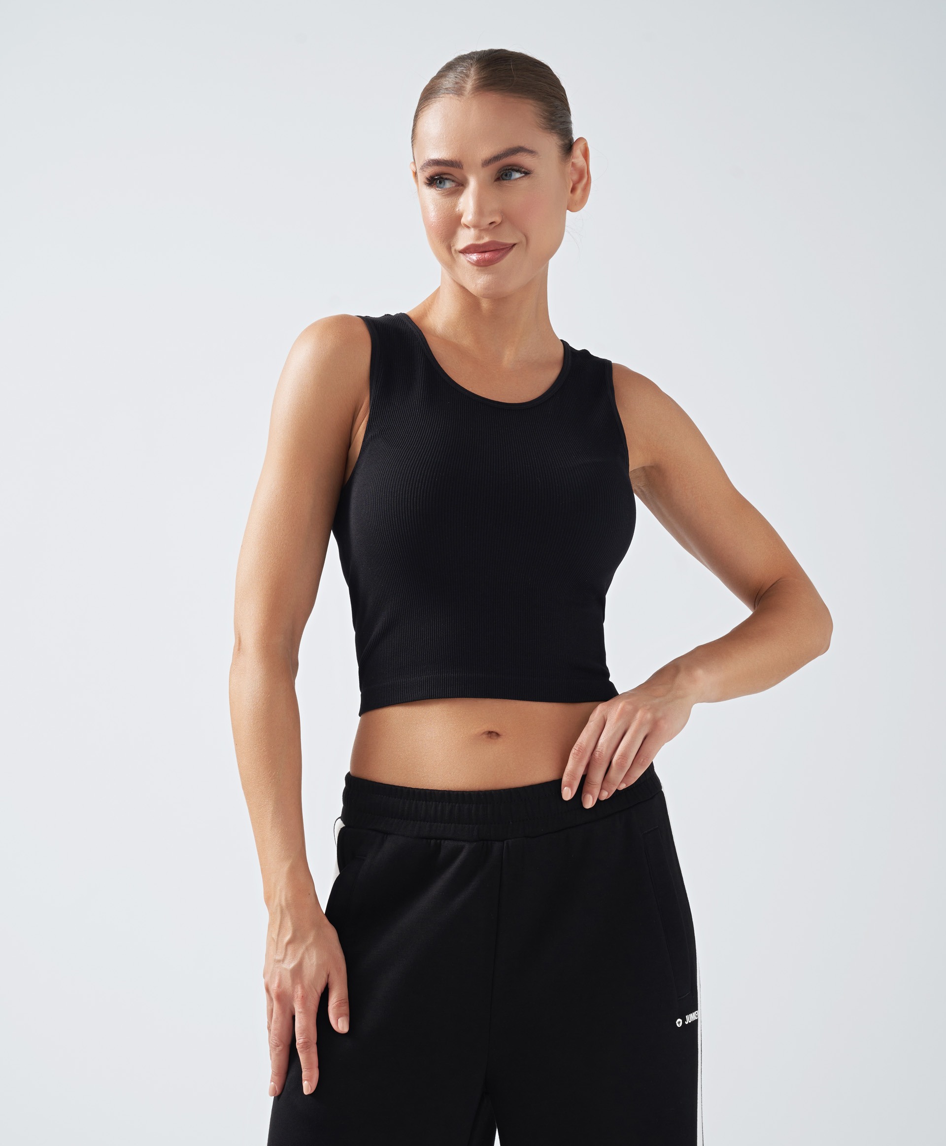Черный топ в рубчик на широких лямках для женщины Jumkey - это не только предмет спортивного гардероба, но и отличный вариант на каждый день. Укороченная майка выполнена по технологии "Knitt". Фактурная ткань смотрится интересно, а классический черный цвет добавляет универсальности и практичности. Нейлон в составе делает изделие прочным и износостойким, а эластан - оптимально растяжимым. Для удобства топ окантован эластичными бейками по горловине и рукавам. Модель выполнена максимально лаконично. Единственная контрастная, но неброская деталь - логотип на спинке.