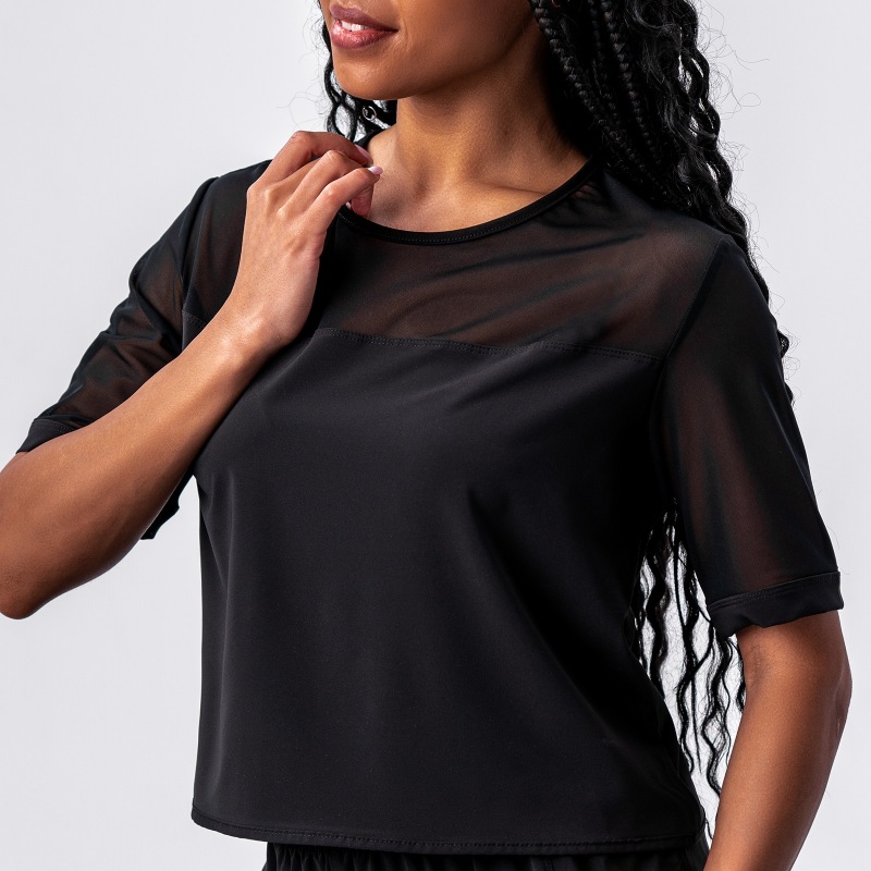 Женский укороченный топ с короткими рукавами из сетки и вставками из сетки.