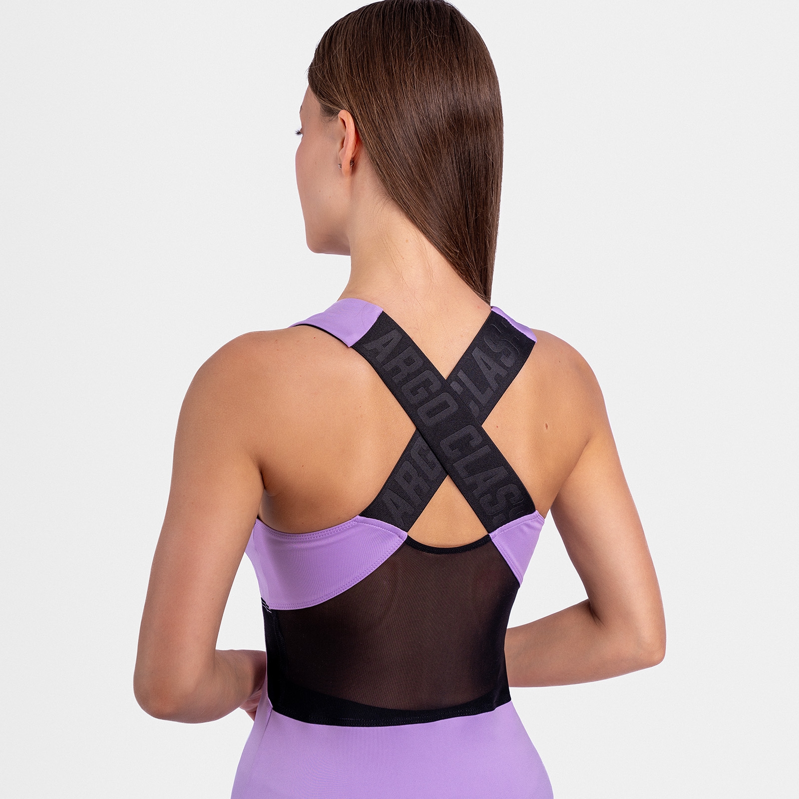 Женская спортивная майка с декоративными бретелями на спинке и вставкой из сетки.