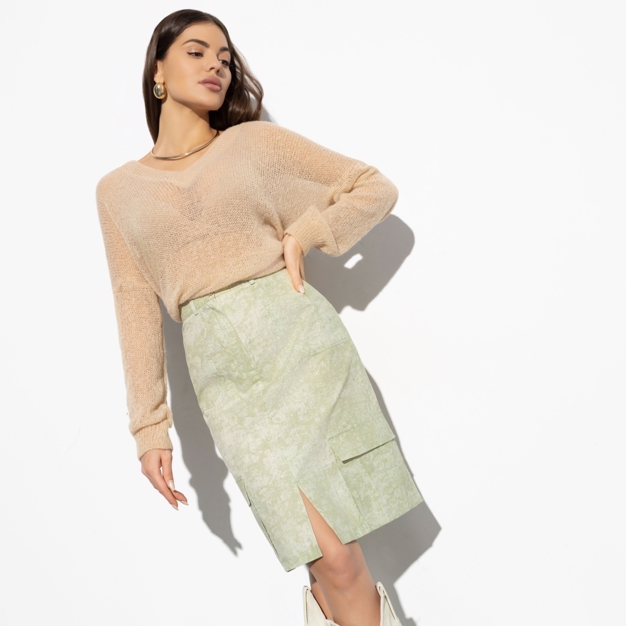 Если выбирать самую модную вещь лета, это точно будет юбка! Тем более, такая. Три супертренда: карго, накладные карманы и длина до колена. Можешь сделать образ строгим или добавить капельку нежности.