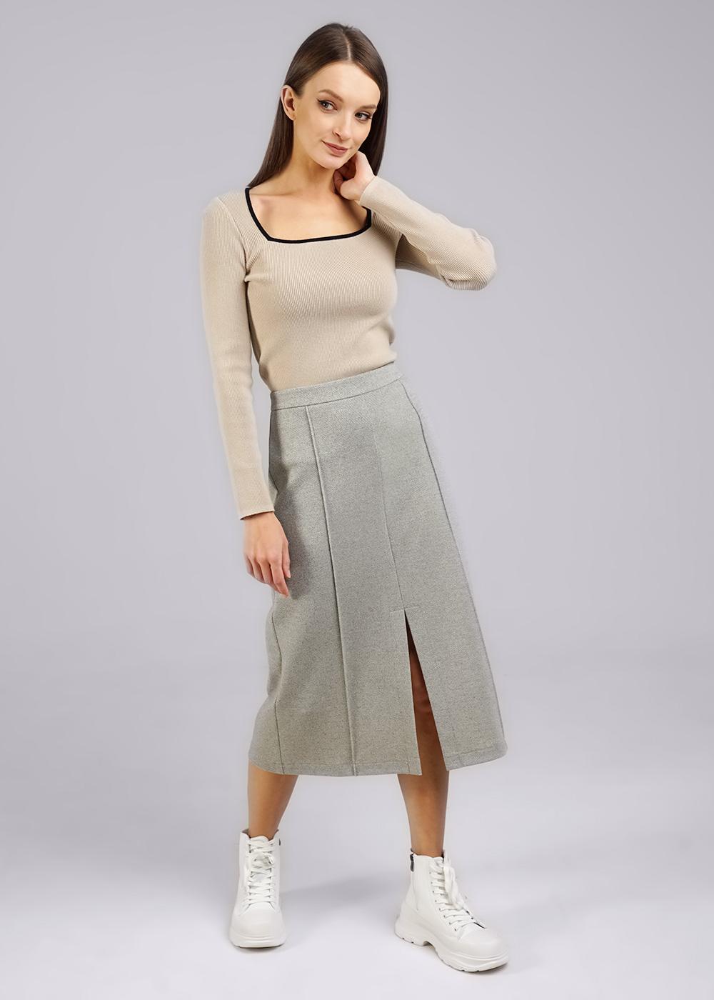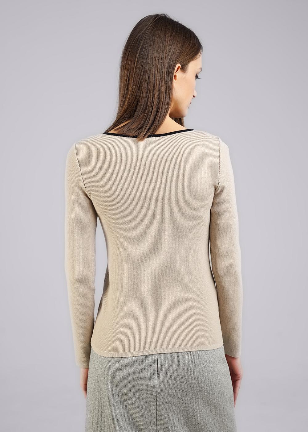 Вязаный джемпер из эластичной пряжи с вискозой в составе. Длинный втачной рукав. Квадратная форма горловины по краю декорирована контрастной черной отделкой.
