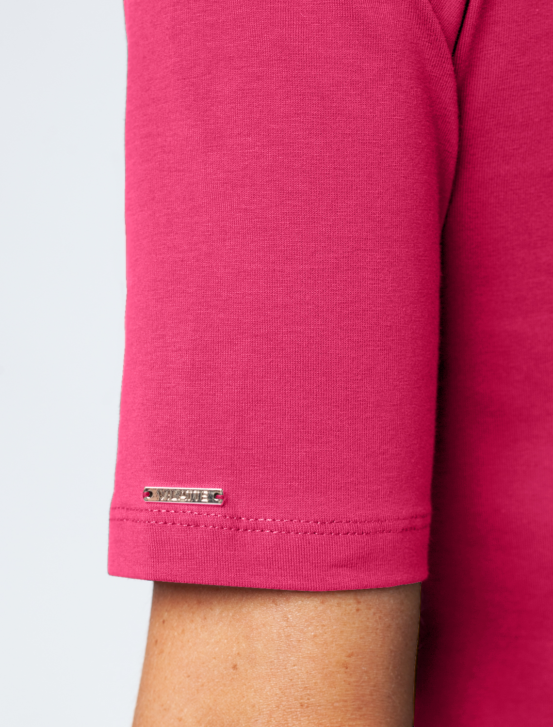 Базовая водолазка цвета этого года viva magenta с коротким рукавом выполнена из премиального хлопка с добавлением эластичных волокон. Гладкий трикотаж обеспечит гарантированный комфорт и удобство в использовании. На рукаве изделия металлическая нашивка с логотипом бренда. Совет стилиста: водолазку с коротким удобно сочетать с жакетом или блузкой. Также как самостоятельный верх к широким брюкам.