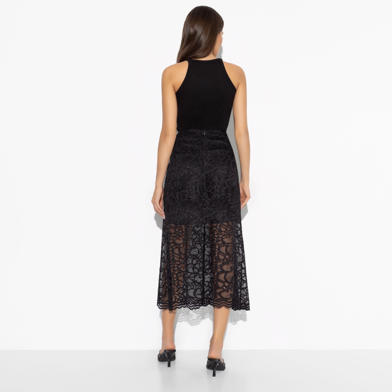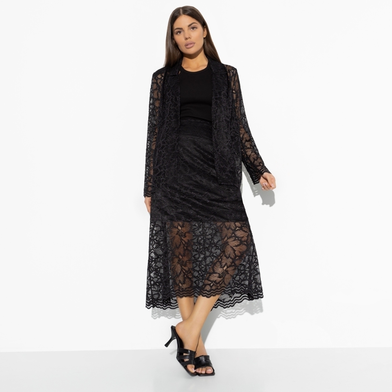 Предлагаем поднять бокалы за то, что женственность стала горячим трендом. Кружевная юбка на пике популярности. Изящное заигрывание с миром маскулинности, где победа будет однозначно на вашей стороне. Юбка из кружева в длине миди. Чуть расклешена к низу. Есть подклад. Юбка застегивается на скрытую молнию по задней части изделия.