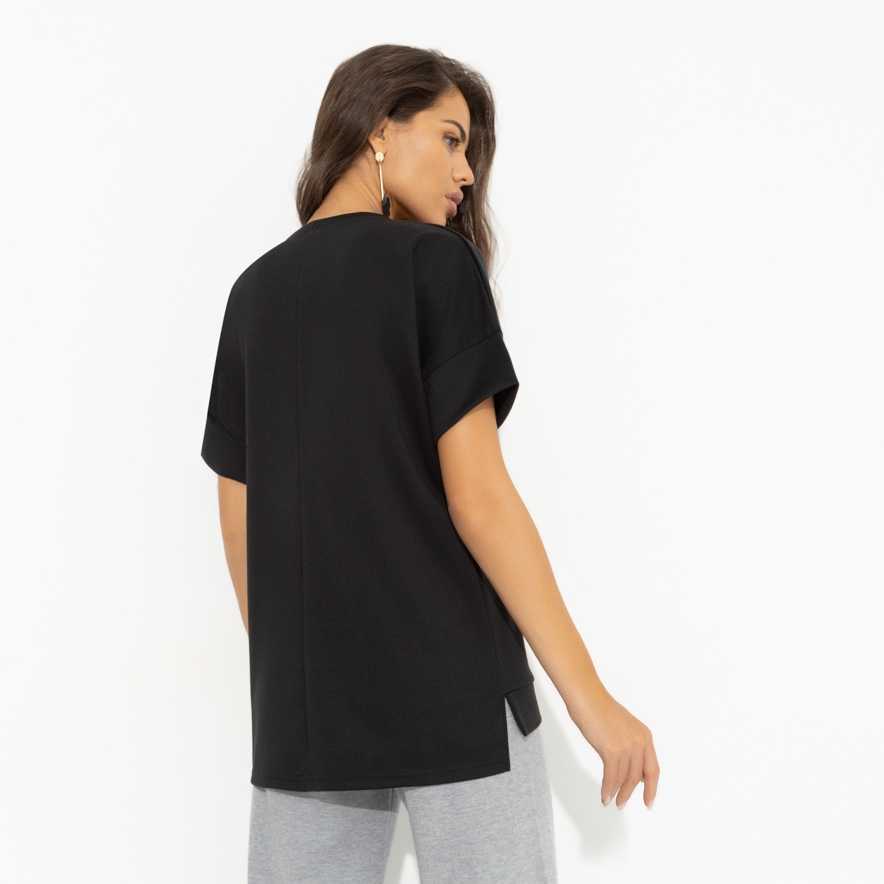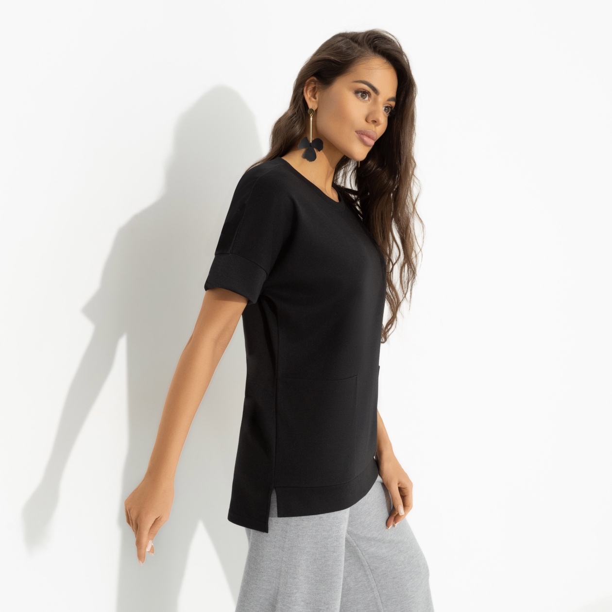 Если вы еще не определились со стилем, отдайте предпочтение классике. Вечно модный черный и силуэт, подходящий всему и всегда – выбор на века. Помните, что выигрывает тот, кто не разменивается. Туника удлиненная прямого силуэта. Карманы по передней части изделия. Отвороты на рукавах прошиты. Деликатный разрез по боковым сторонам изделия.