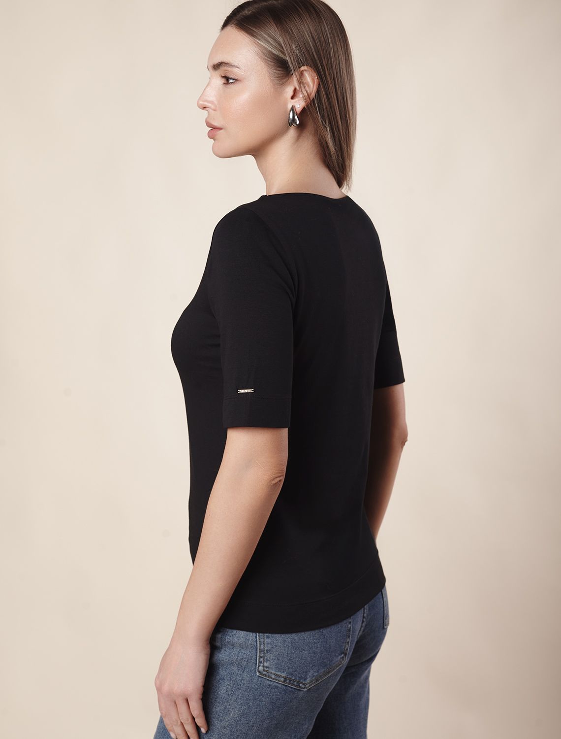 Футболка выполнена из премиального хлопка с добавлением эластана.Гладкий трикотаж обеспечит гарантированный комфорт и удобство в использовании. На рукаве металлическая нашивка с логотипом бренда. Издели будет хорошо сочетаться с любыми низами, жилетками и кардиганами, став выгодной инвестицией в базовый гардероб.