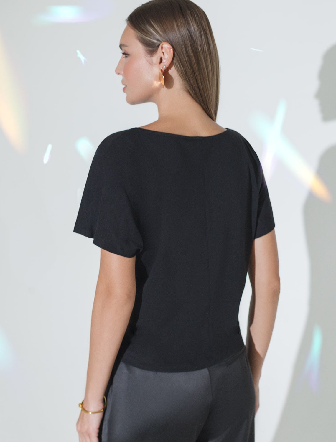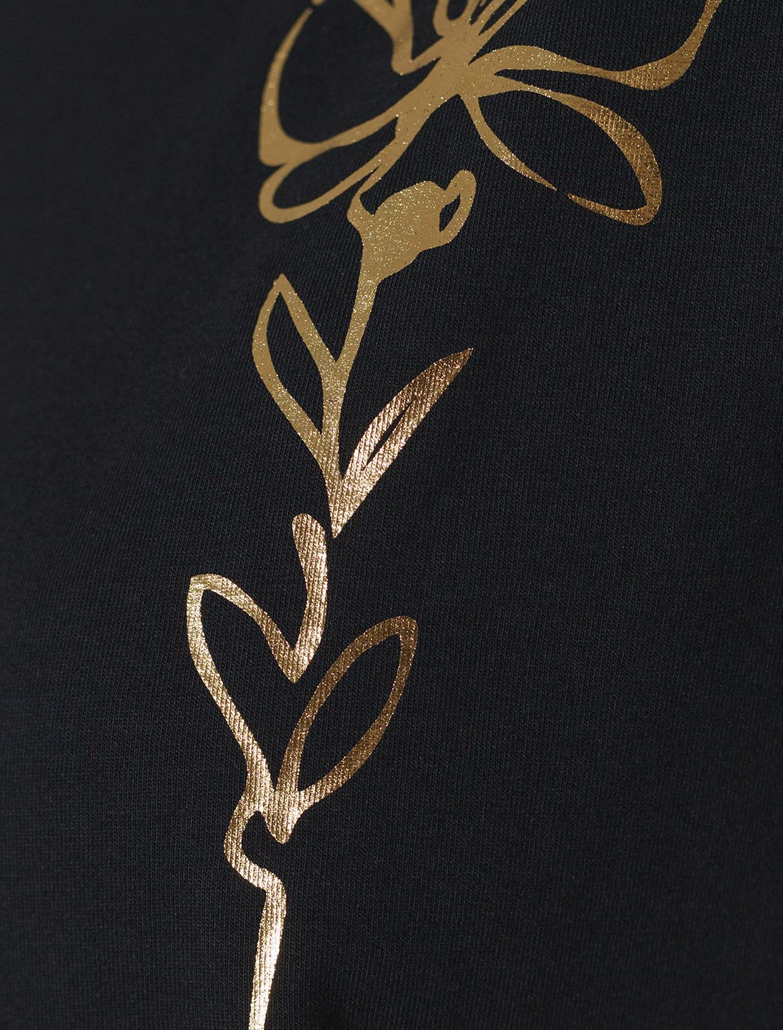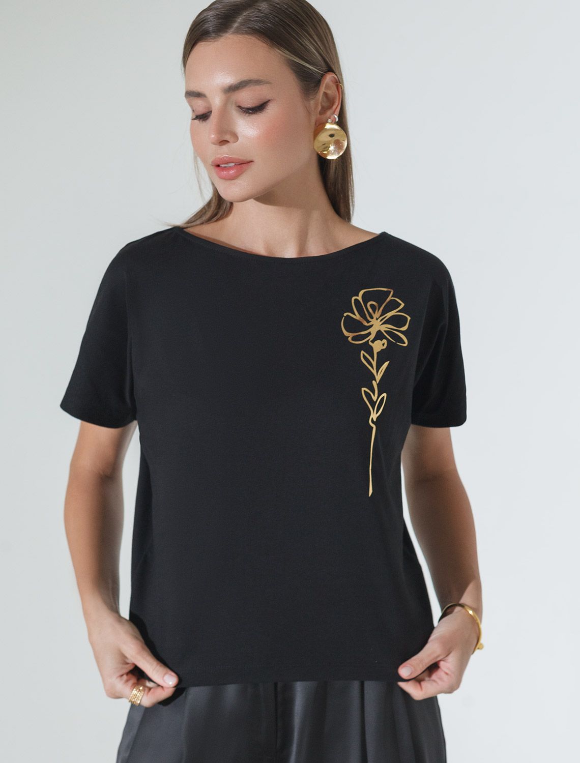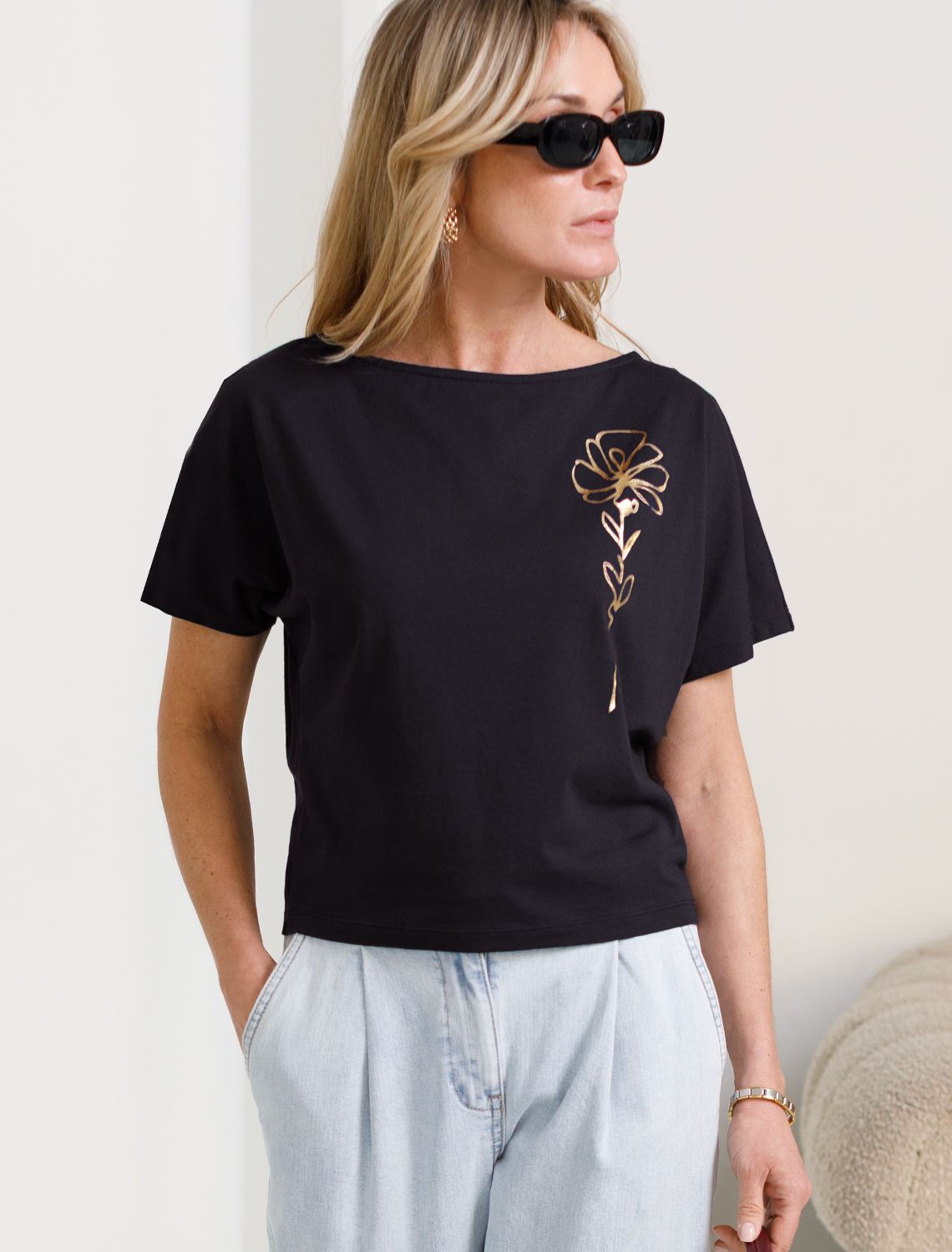 Футболка черного цвета идеально подходит для вечеринки и создания яркого образа. Оригинальный блестящий принт из фольги в виде цветка придает изделию шикарный вид, который привлечет внимание на любом мероприятии. Модель с вырезом лодочка и цельнокроеным рукавом обеспечивает свободу движений и комфорт в носке. Такой фасон изделия подходит на большие размеры, гармонично сидит на фигуре и помогает создать легкий акцент на достоинствах. Благодаря особенностям кроя с цельнокроеным рукавом удается искусно скроет любые возможные недостатки в области плеч и рук, обеспечивая комфортное прилегание без ощущения скованности. Аккуратный вырез лодочка красиво подчеркивает шею и делает образ элегантным, сохраняя актуальность для разных случаев — от рабочих встреч до вечерних прогулок и праздничных мероприятий.