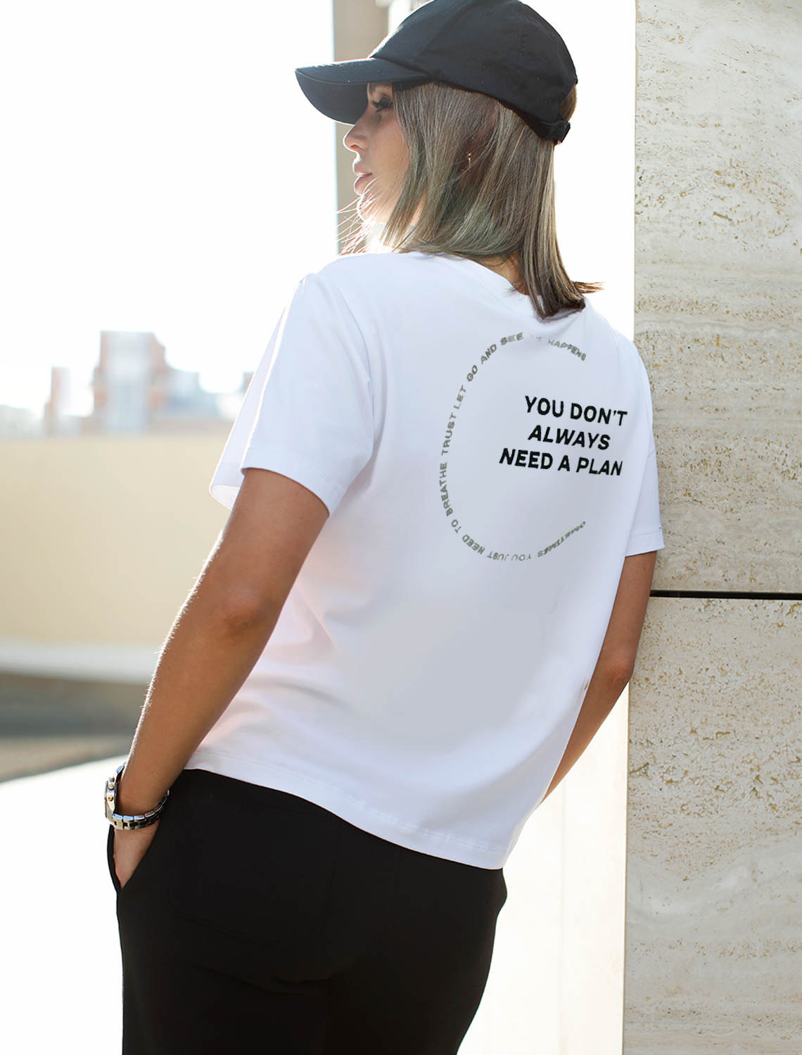 Перевод надписи: «Не всегда нужен план. Иногда просто нужно сделать вдох, довериться, и ты увидишь, что произойдет» Футболка выполнена из премиального хлопка. Крупная надпись выполнена красками, маленькая - золотой фольгой с устойчивым покрытием. Наличие эластана в составе способствует комфорту и формоустойчивости, помогая сохранить изделие в течении долгого времени в идеальном состоянии. Модель дополнена фирменным металлическим логотипом бренда.