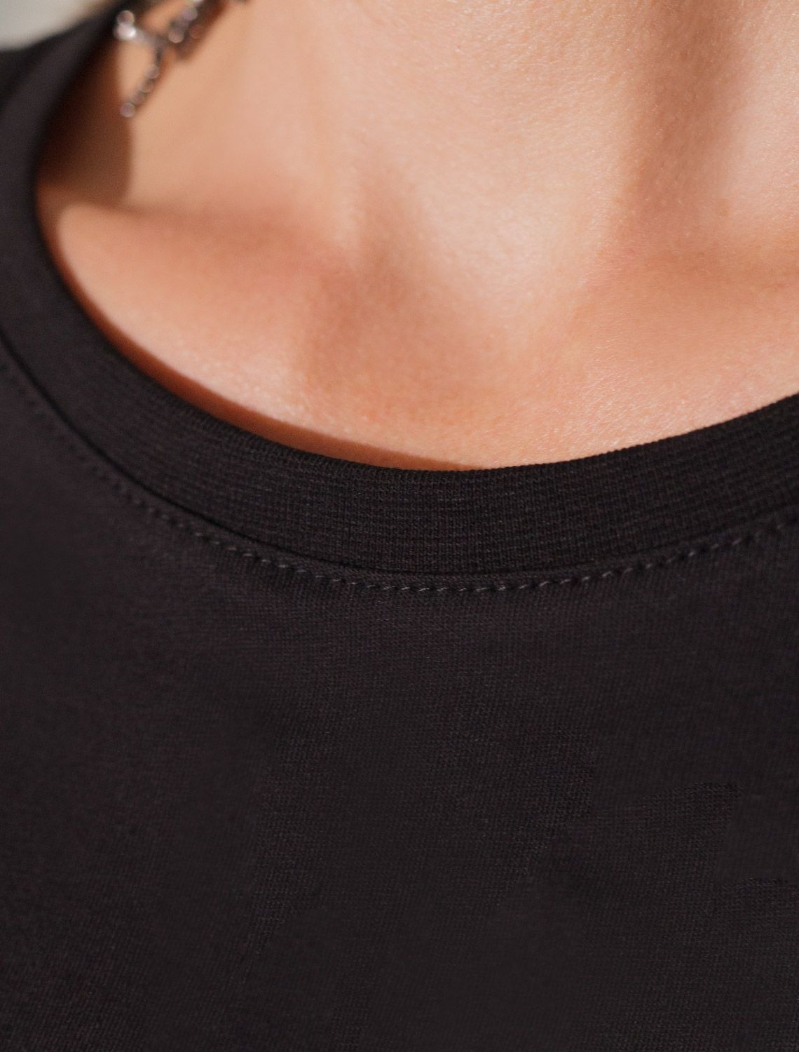 Футболка черного цвета идеально подходит для вечеринки и создания яркого образа. Оригинальный принт из золотистой фольги придает изделию шикарный вид, который привлечет внимание на любом мероприятии. Модель с круглым вырезом и классическим коротким рукавом обеспечивает свободу движений и комфорт в носке. Такой фасон изделия подходит на большие размеры, гармонично сидит на фигуре и помогает создать легкий акцент на достоинствах. Аккуратный круглый вырез красиво подчеркивает шею и делает образ элегантным, сохраняя актуальность для разных случаев — от рабочих встреч до вечерних прогулок и праздничных мероприятий.