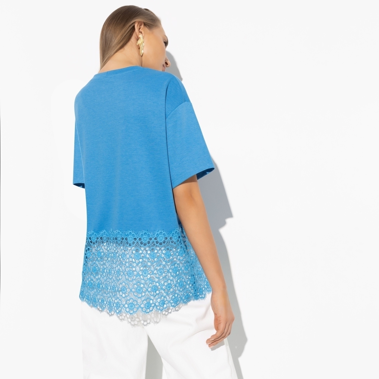 Футболка выполнена из высококачественного трикотажа «милано» с добавлением кружева. Состав ткани включает 65% полиэстера, 30% вискозы и 5% спандекса, что обеспечивает ей долговечность и эластичность. Материал мягкий на ощупь, хорошо пропускает воздух и сохраняет форму после многочисленных стирок. Эта футболка гарантирует комфорт на протяжении всего дня, подчеркивая при этом ваш безупречный стиль.