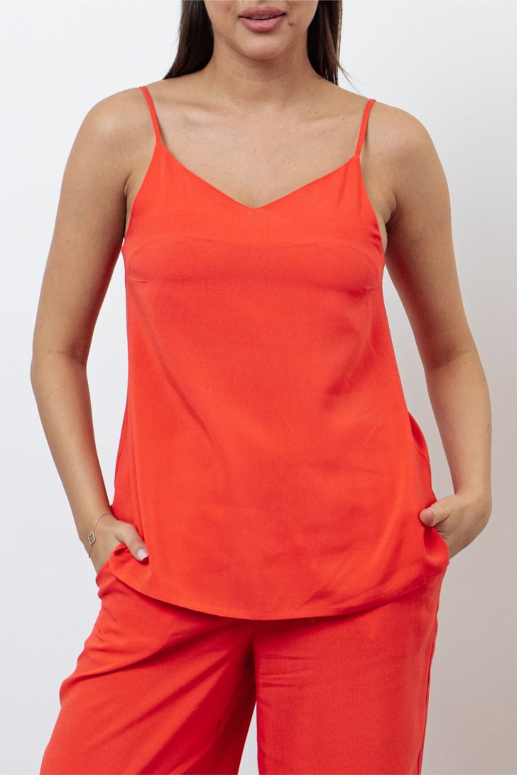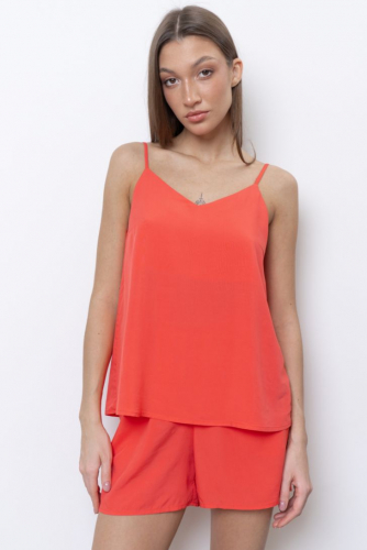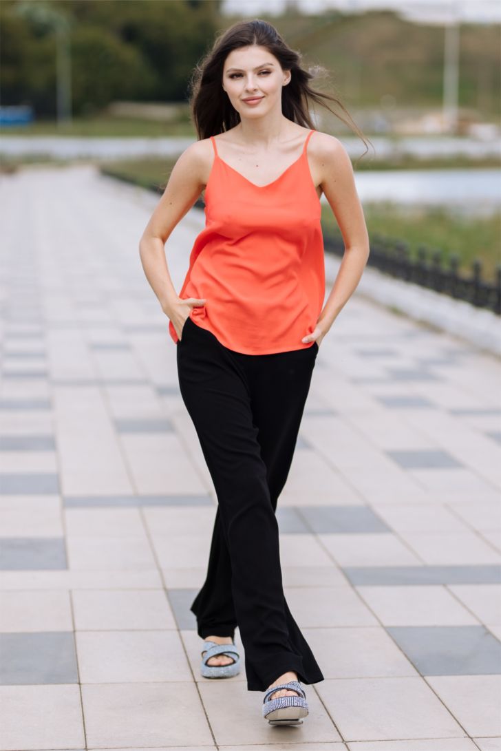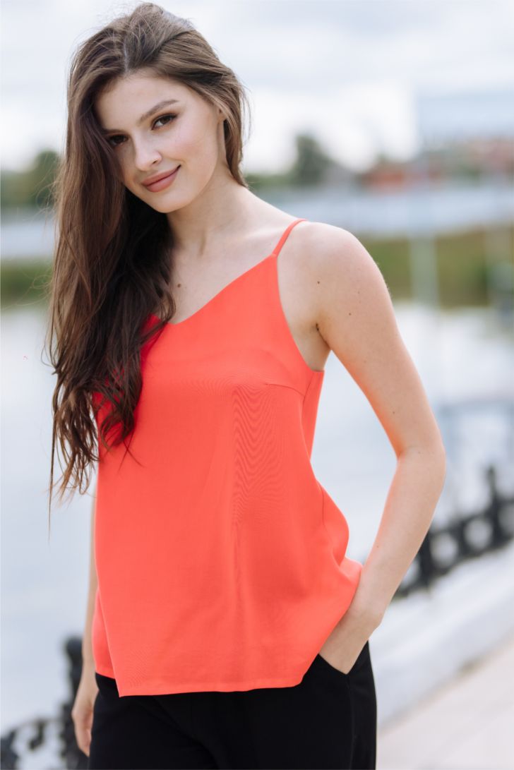 Топ на тонких регулируемых бретелях идеально подчеркивает фигуру и создает ощущение легкости и свободы. Вырез топа V-образный, глубокий. Модель представлена в 4-х цветовых решениях