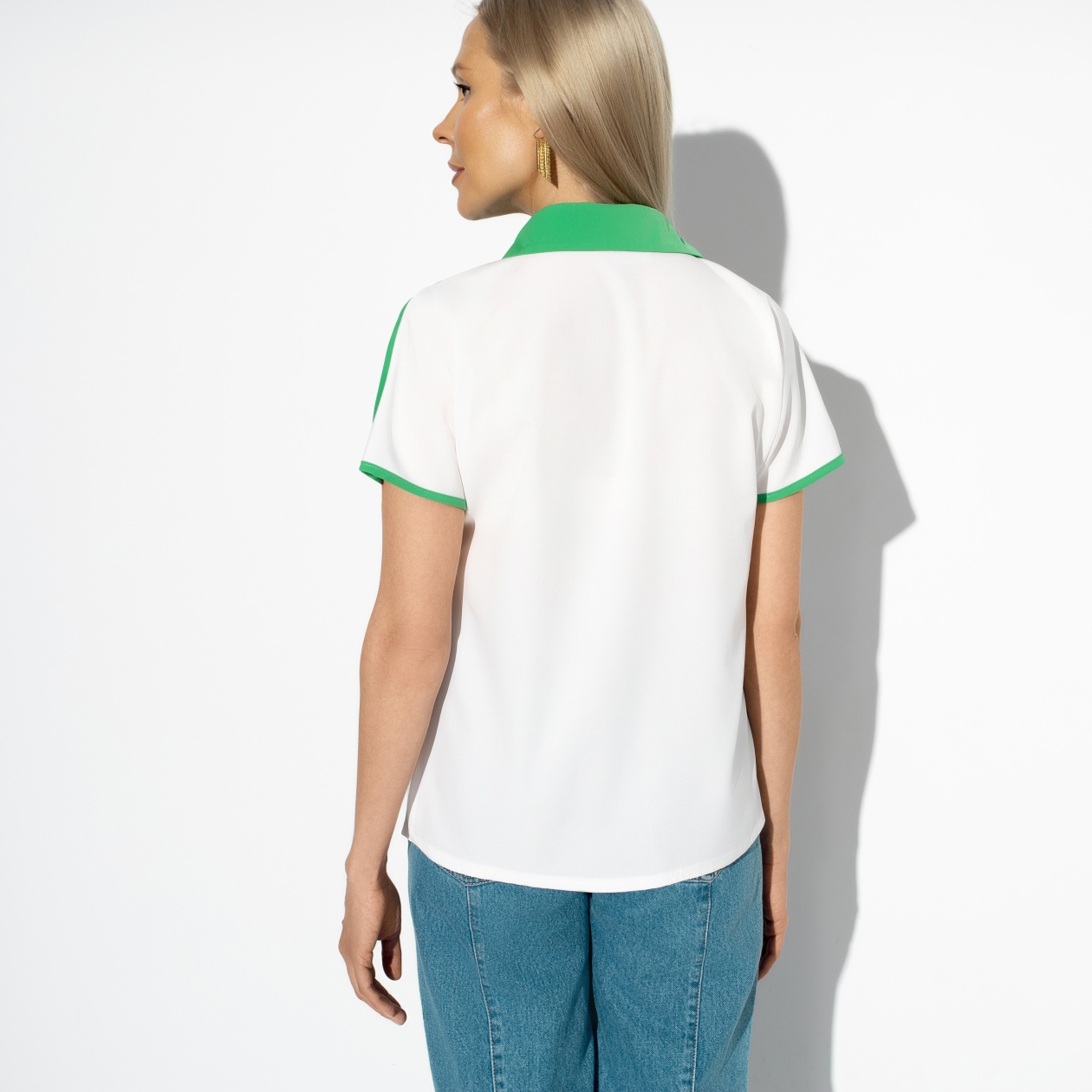 Блуза — это игра на контрастах, как стиль жизни. Она подходит для тех, кто способен находить баланс между серьезностью и легкостью, строгостью и весельем. Любите сладости, но не забываете о пробежках по утрам? Тогда эта модель идеально подчеркнёт вашу многогранность. Белая основа с яркой зеленой окантовкой станет символом вашего уникального подхода к жизни. Партия таких блуз, приобретенных оптом, поможет вам выделить свою торговую точку среди конкурентов, предлагая покупателям высокое качество и непревзойденный стиль.