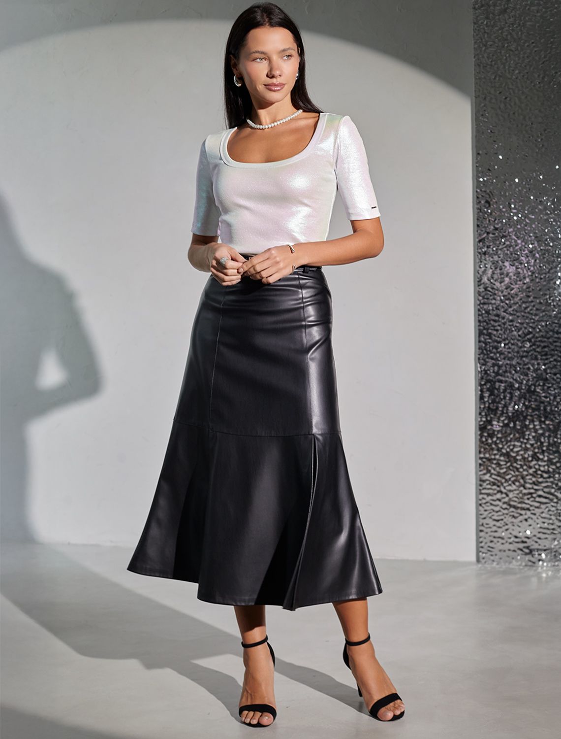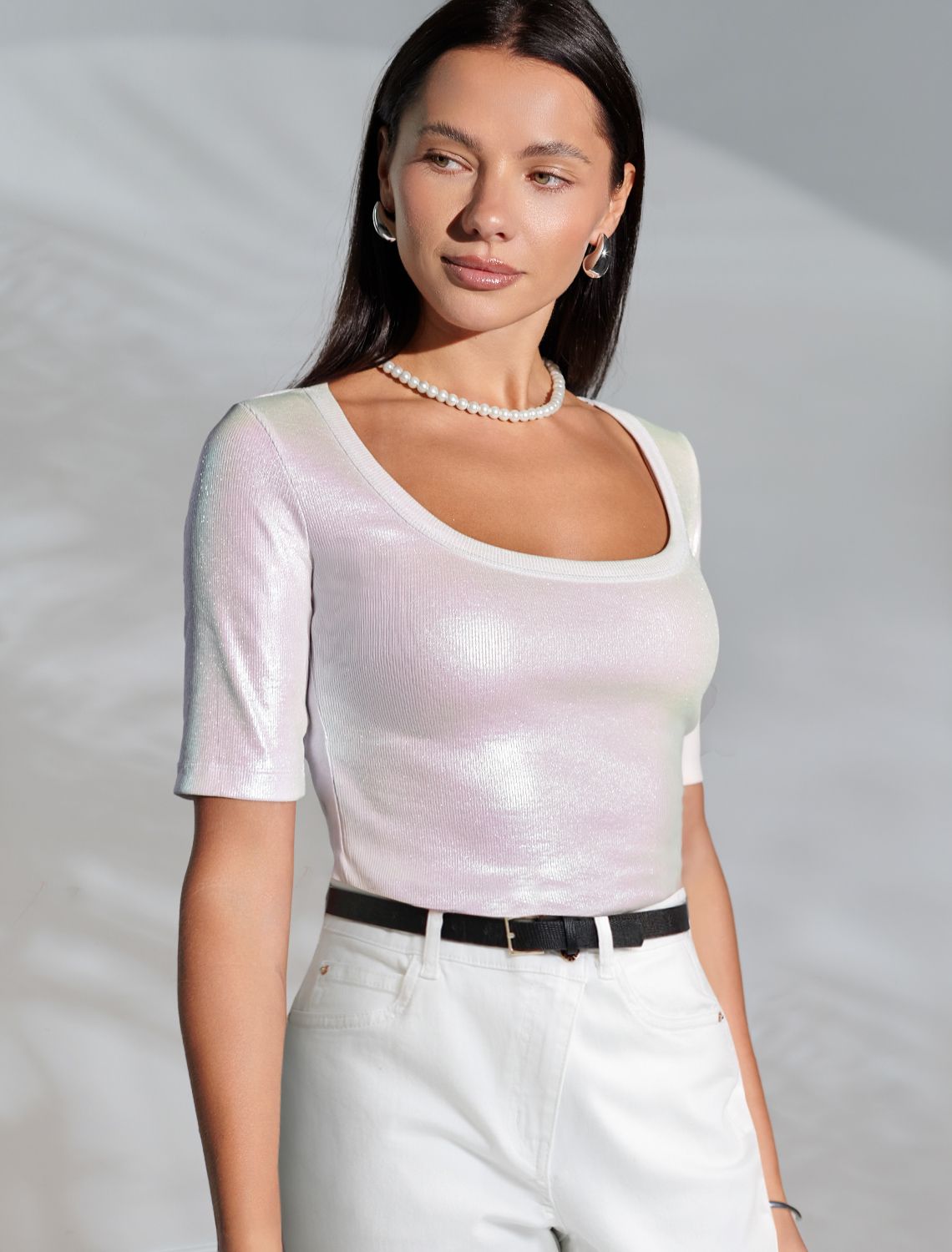 Повседневная футболка универсальна: она сочетается с джинсами, юбками или строгими брюками — легко создать как деловой образ для офиса, так и наряд для вечеринки или ужина вне дома. Матовое покрытие создает благородный блеск без лишней яркости, благодаря чему футболка смотрится свежо и актуально.