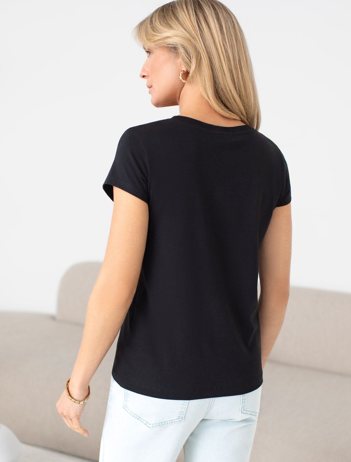 Футболка черного цвета идеально подходит для вечеринки и создания яркого образа. Оригинальный принт из фольги золотистого цвета придает изделию шикарный вид, который привлечет внимание на любом мероприятии. Модель с круглым вырезом и классическим коротким рукавом обеспечивает свободу движений и комфорт в носке. Такой фасон изделия подходит на большие размеры, гармонично сидит на фигуре и помогает создать легкий акцент на достоинствах. Аккуратный круглый вырез красиво подчеркивает шею и делает образ элегантным, сохраняя актуальность для разных случаев — от рабочих встреч до вечерних прогулок и праздничных мероприятий.