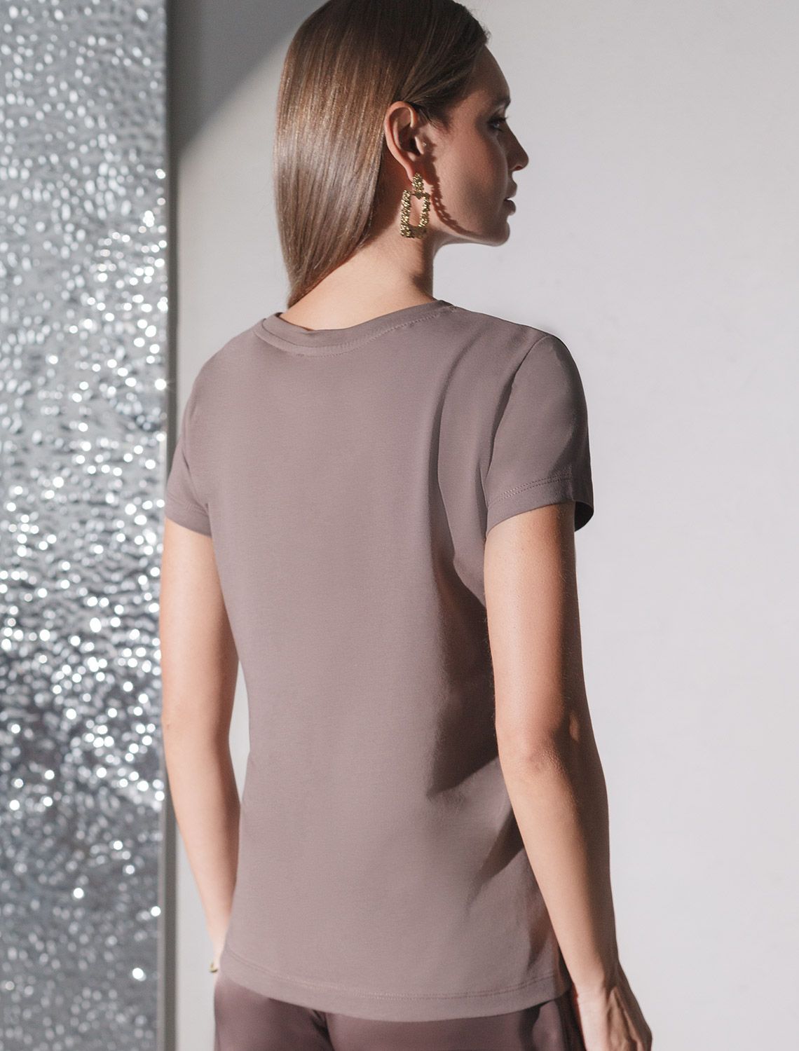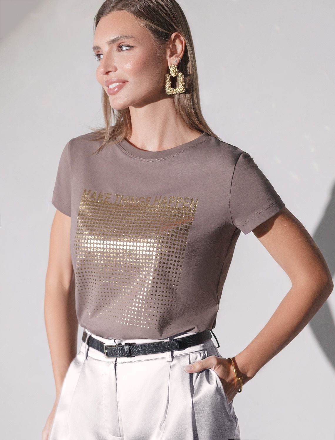 Футболка кофейного цвета идеально подходит для вечеринки и создания яркого образа. Оригинальный принт из фольги золотистого цвета придает изделию шикарный вид, который привлечет внимание на любом мероприятии. Модель с круглым вырезом и классическим коротким рукавом обеспечивает свободу движений и комфорт в носке. Такой фасон изделия подходит на большие размеры, гармонично сидит на фигуре и помогает создать легкий акцент на достоинствах. Аккуратный круглый вырез красиво подчеркивает шею и делает образ элегантным, сохраняя актуальность для разных случаев — от рабочих встреч до вечерних прогулок и праздничных мероприятий.