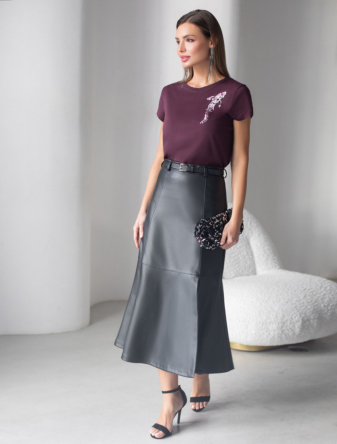Футболка цвета бургунди идеально подходит для вечеринки и создания яркого образа. Оригинальный принт из ярких пайеток в виде рыбки придает изделию шикарный вид, который привлечет внимание на любом мероприятии. Модель с круглым вырезом и классическим коротким рукавом обеспечивает свободу движений и комфорт в носке. Такой фасон изделия подходит на большие размеры, гармонично сидит на фигуре и помогает создать легкий акцент на достоинствах. Аккуратный круглый вырез красиво подчеркивает шею и делает образ элегантным, сохраняя актуальность для разных случаев — от рабочих встреч до вечерних прогулок и праздничных мероприятий.