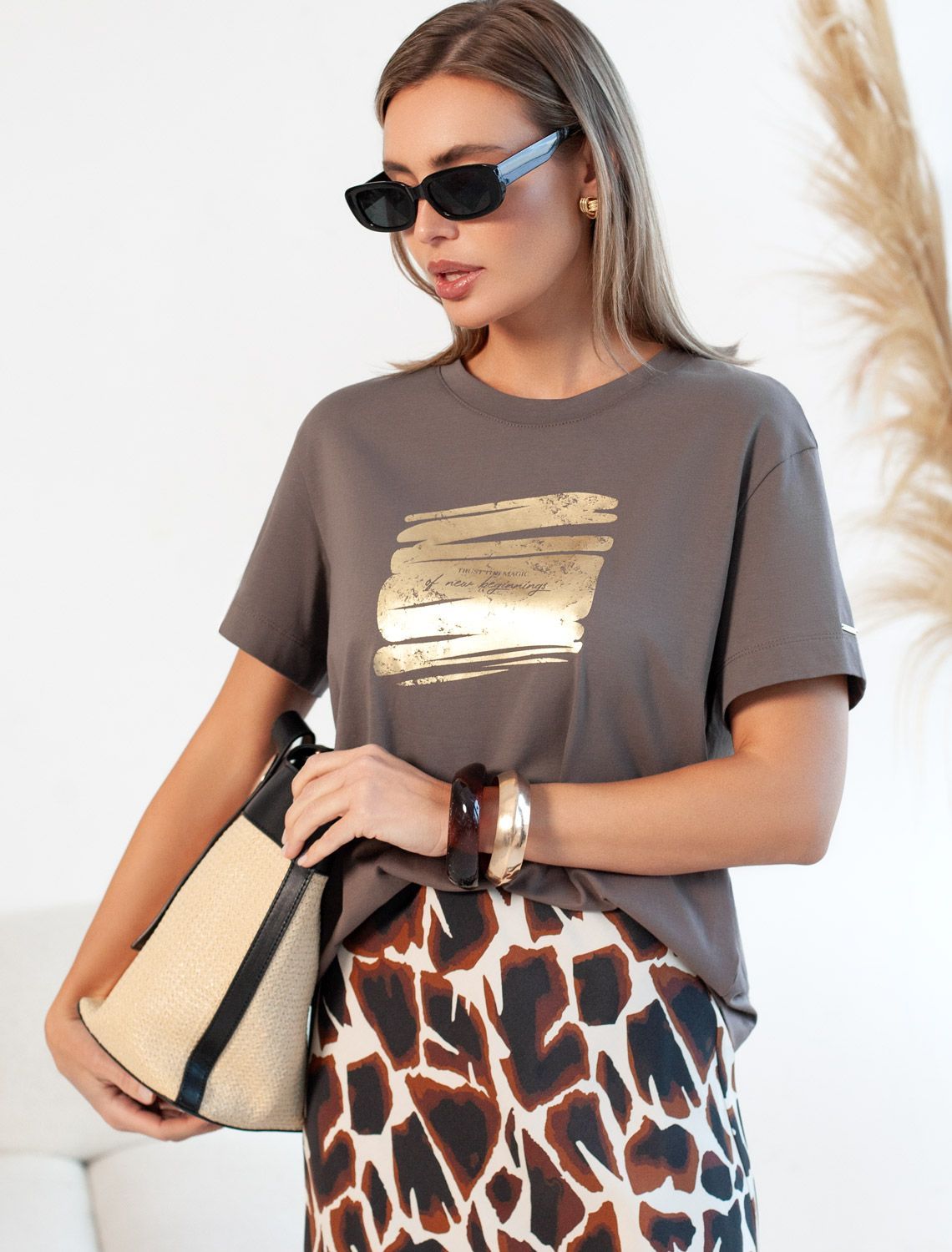 Стильная базовая футболка кофейного цвета с золотистым принтом фольгой выполнена из плотного хлопка с эластаном для комфортной посадки на любую фигуру. Прямая футболка классического кроя с круглым вырезом, прекрасно подходит для разных типов фигуры, в том числе и на большие размеры. Мягкость хлопка вместе с небольшой долей эластана гарантирует идеальную посадку и свободу движений. Легкая натуральная дышащая ткань премиального качества делает футболку с коротким рукавом идеальным вариантом для повседневной носки дома, на работу или офис. Однотонная футболка дополнена авторским аккуратным принтом с минималистичной надписью, который придает праздничный и элегантный вид без лишней вычурности. Блестящий принт аккуратно украшает, добавляя изысканный акцент и создавая легкий мерцающий эффект. Перевод надписи Trust the magic of new beginnings - Доверьтесь магии новых начинаний.