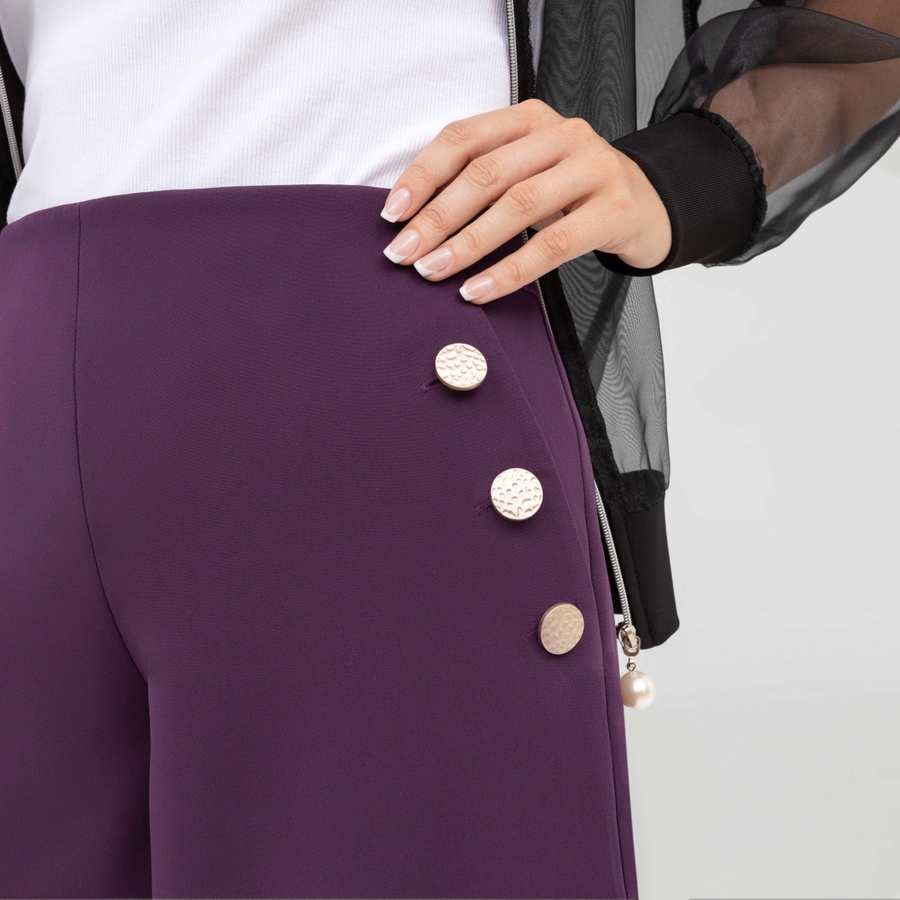 Шорты с декоративными пуговицами «Вдохновленная трендами (аметист)» — это не просто элемент гардероба, а настоящий манифест стиля и смелости. Их насыщенный аметистовый оттенок покоряет с первого взгляда, вызывая ассоциации с роскошью и утонченностью. Каждая декоративная пуговица мастерски подчеркнута на фоне костюмной ткани «барби», что придает образу нотку элегантности и шика. Эти шорты идеально подходят для тех, кто хочет выделиться из толпы и создать трендовый look в любой ситуации. Приобретая эту модель оптом, вы получаете возможность предложить своим клиентам нечто невероятно стильное и современное, что обязательно привлечет внимание и вызовет восторг.