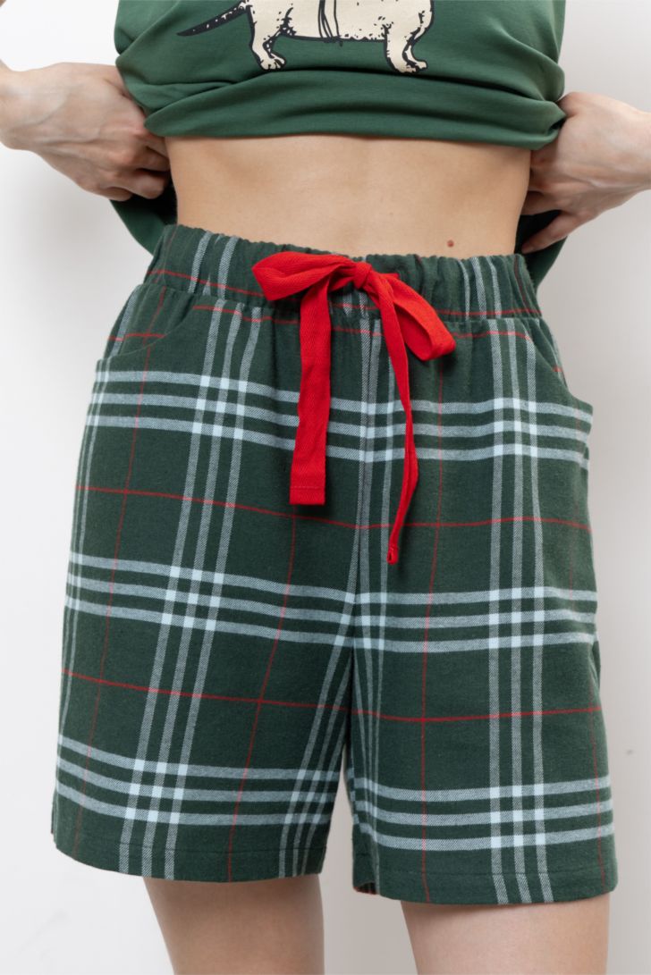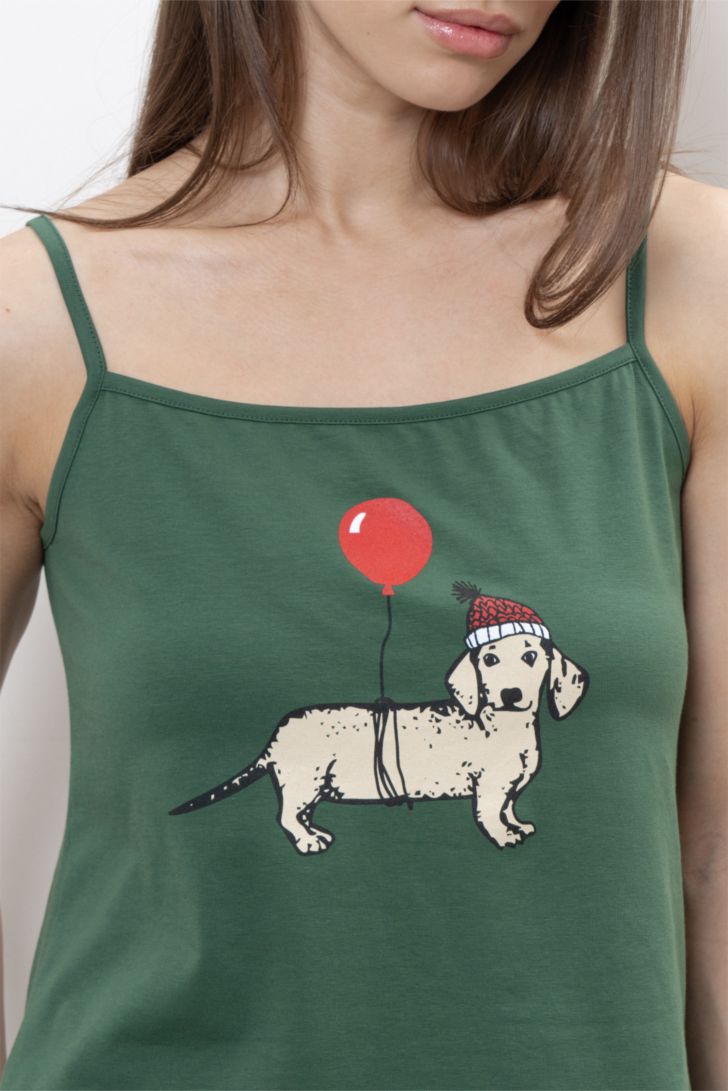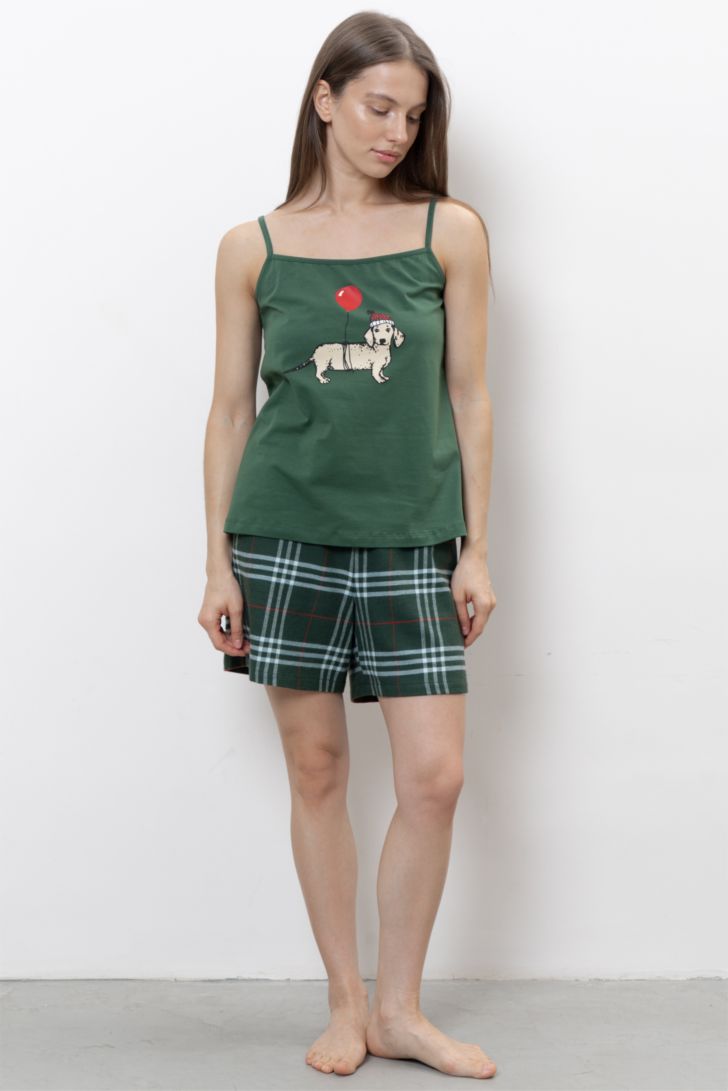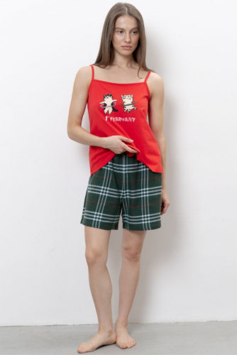 Пижама женская состоит из топа на тонких регулируемых бретелях и шорт свободного прилегания. Шорты средней длины с функциональными карманами. В поясе кулиса с контрастной лентой. Пижама представлена в двух цветовых решениях. Топ пижамы декорирован тематическим минималистичным принтом.