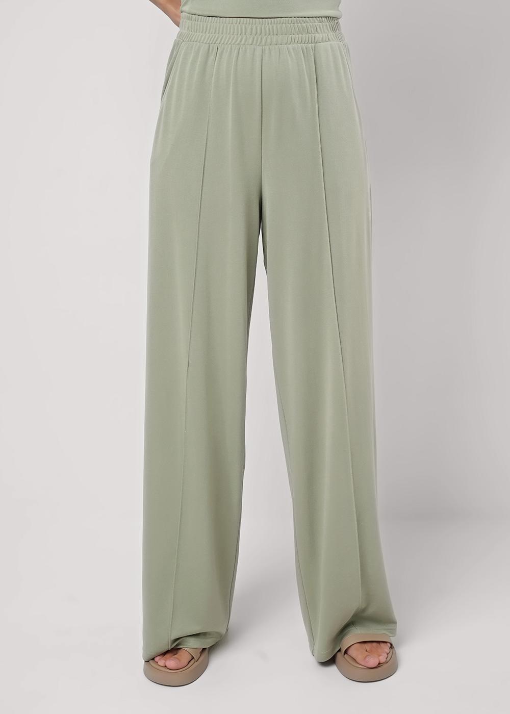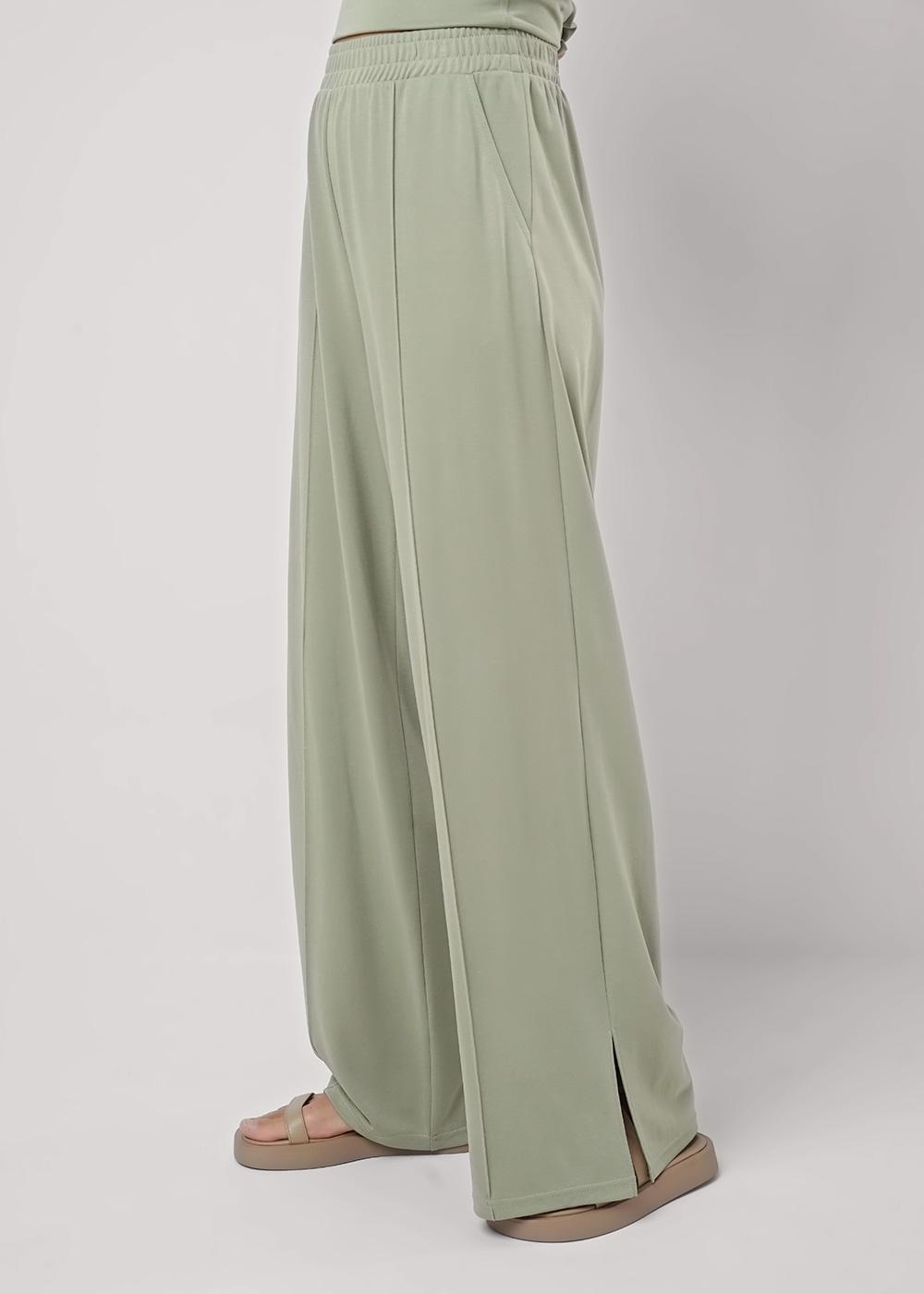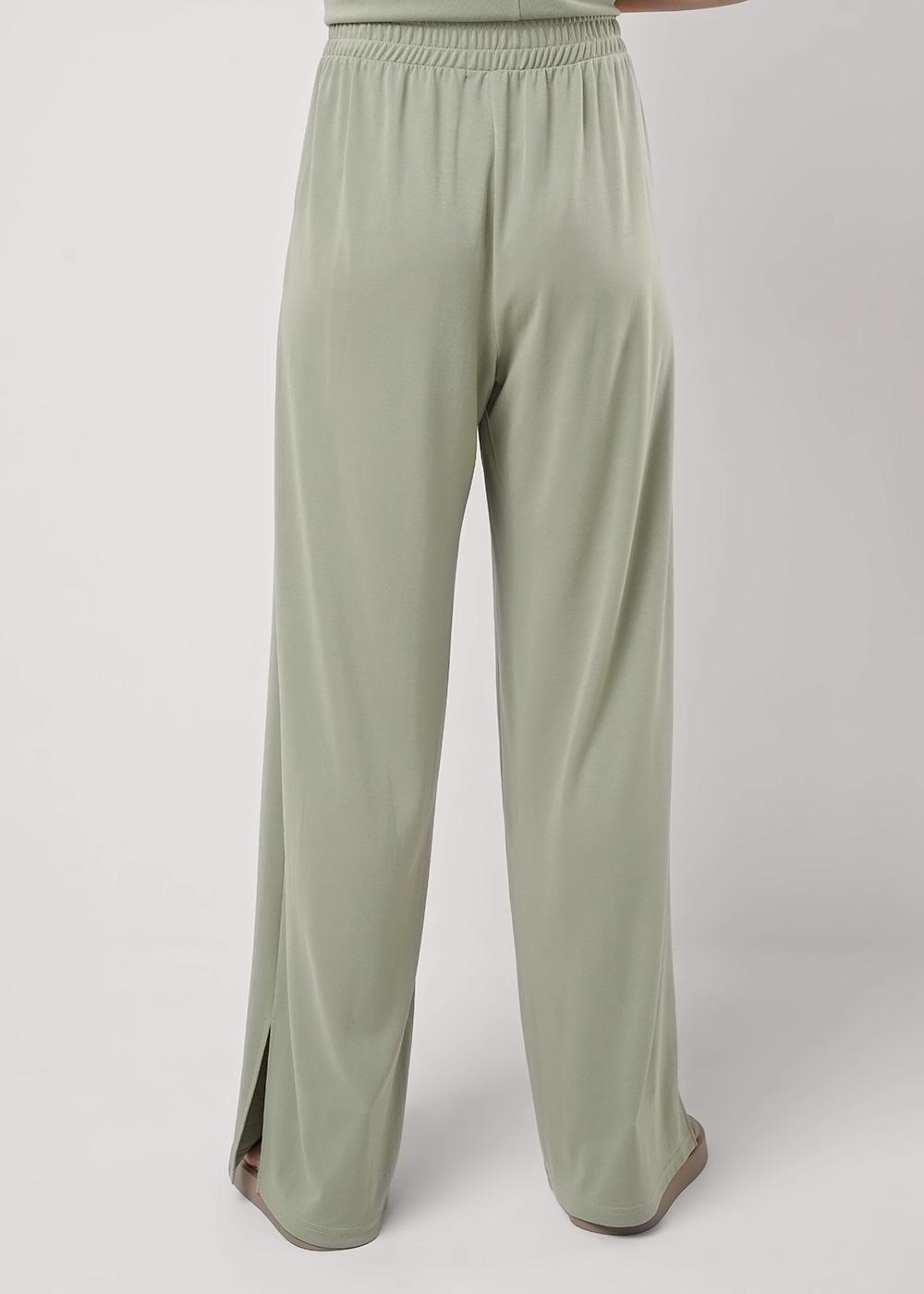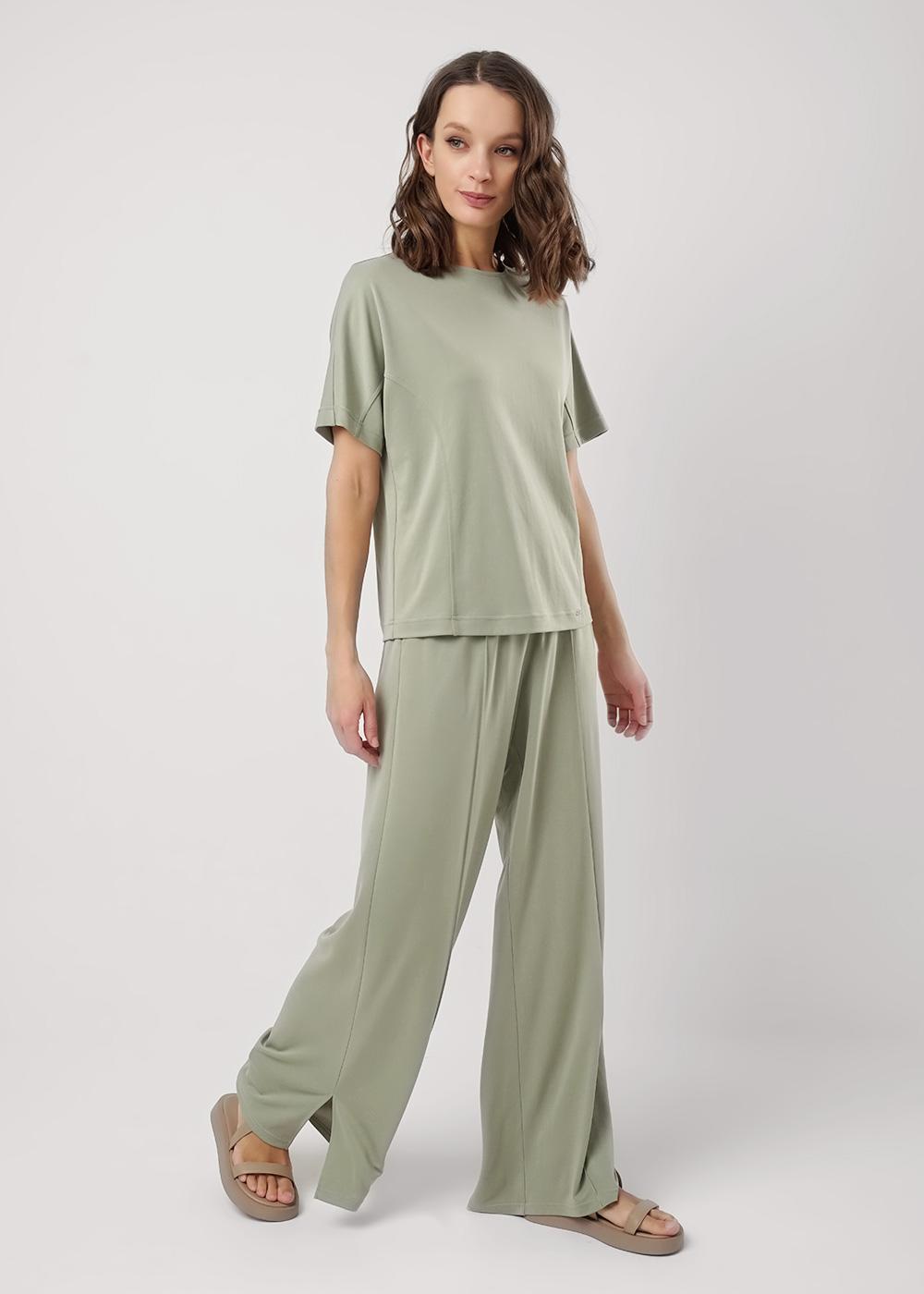 Брюки широкие из вискозного трикотажного полотна пике. По талии притачной пояс с внутренней резинкой. Боковые карманы с отрезным бочком. По переду и спинке защипы, внизу боковые разрезы.