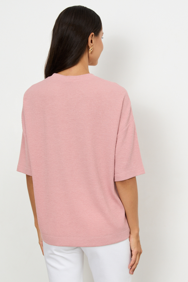 Джемпер из фактурного эластичного полотна. Свободный силуэт со спущенной линией плеча и коротким рукавом. Вырез горловины оформлен бейкой. В таблице размеров представлены параметры человека, а не изделия.