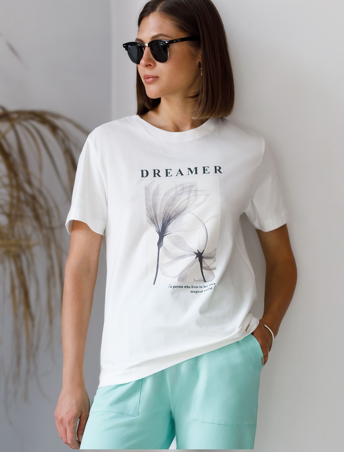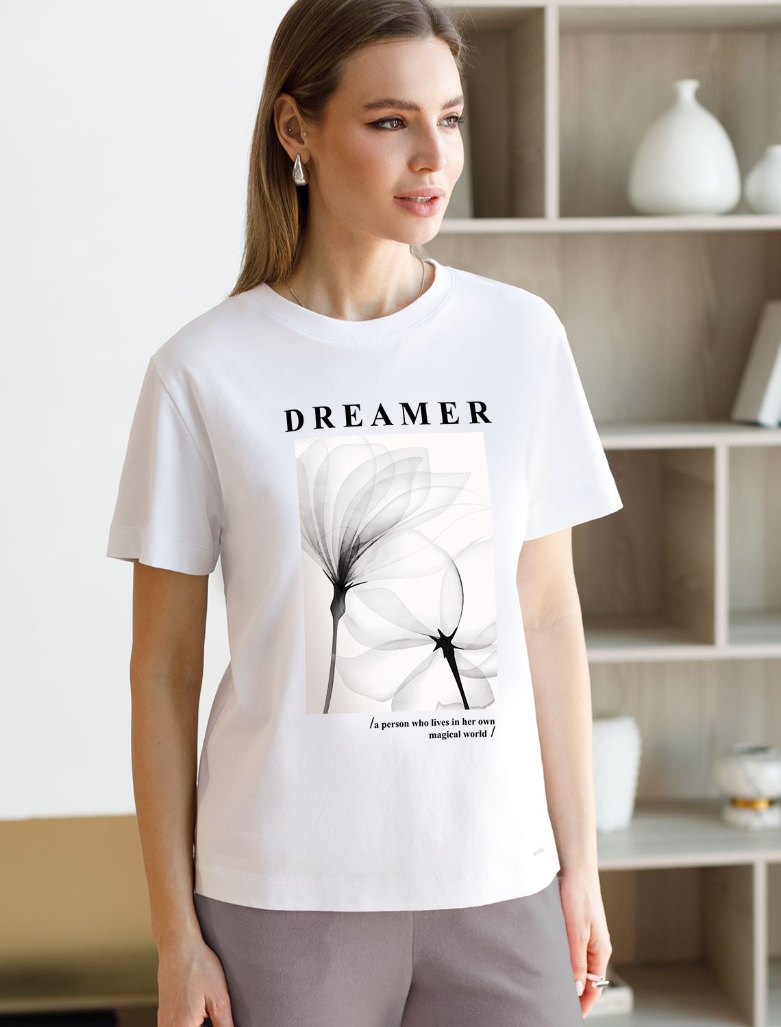 Футболка выполнена из премиального хлопка. Авторский принт нанесен красками с устойчивым покрытием. Перевод: «Dreamer - a person who lives in her own magical world - Мечтатель — человек, который живет в своем волшебном мире» Наличие эластана в составе гарантирует абсолютный комфорт и долговечность изделия. Базовая модель впишется в любой гардероб. Дополнительным украшением служит металлическим логотипом бренда.