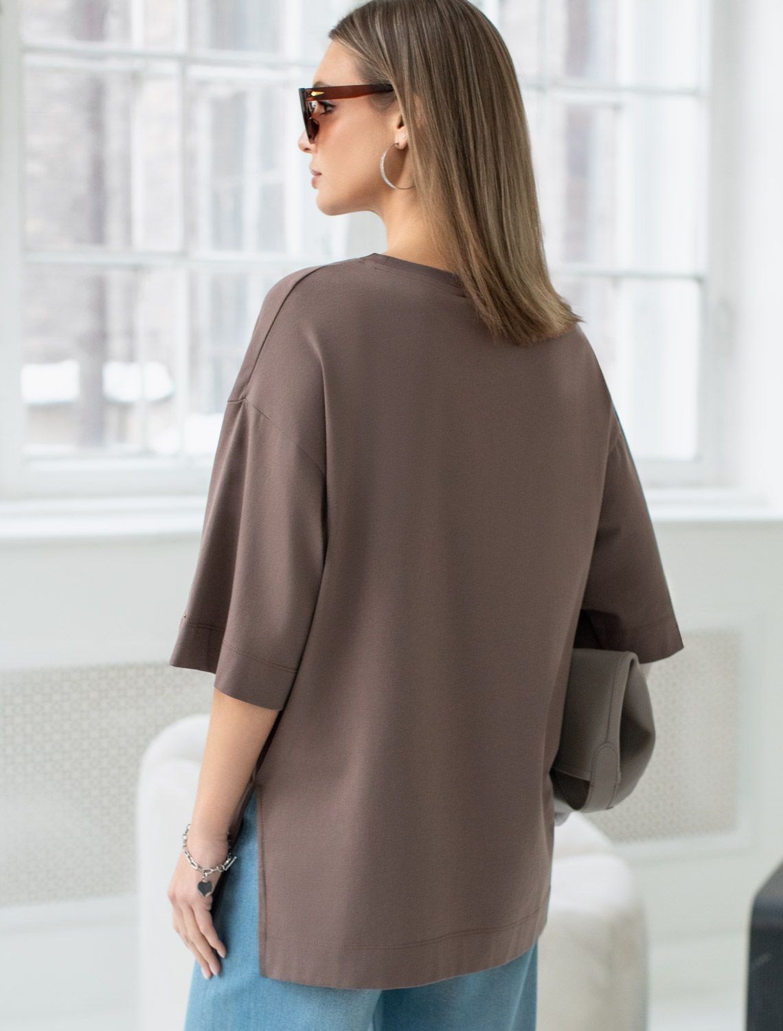 Оверсайз футболка кофейного цвета с из премиального хлопка с добавлением эластана создана для комфорта и стиля каждый день. Натуральный материал приятный к телу, дышащая ткань хорошо держит форму и подходит для повседневной носки дома, в офисе или на прогулке. Классический свободный крой, удлиненный прямой силуэт и свободная посадка делают эту базовую футболку универсальным решением для любой фигуры и роста, включая плюс сайз размеры и беременных девушек, отлично скроет животик. Широкие рукава держат форму и подойдут на полные руки. Нарядная футболка украшена авторским принтом в виде надписи блестящими стразами, которые создают красивый мерцающий эффект. Перевод надписи Whatever - Что бы ни... Такой акцент делает модель уместной как для особых случаев, так и для ежедневных образов.