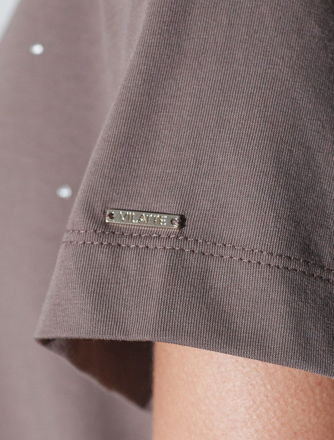 Стильная базовая футболка кофейного цвета с принтом стразами выполнена из плотного хлопка с эластаном для комфортной посадки на любую фигуру. Прямая футболка классического кроя с круглым вырезом, прекрасно подходит для разных типов фигуры, в том числе и на большие размеры. Мягкость хлопка вместе с небольшой долей эластана гарантирует идеальную посадку и свободу движений. Легкая натуральная дышащая ткань премиального качества делает футболку с коротким рукавом идеальным вариантом для повседневной носки дома, на работу или офис. Однотонная футболка дополнена авторским аккуратным принтом, который придает праздничный и элегантный вид без лишней вычурности. Блестящий принт в виде россыпи страз аккуратно украшает, добавляя изысканный акцент и создавая легкий мерцающий эффект.