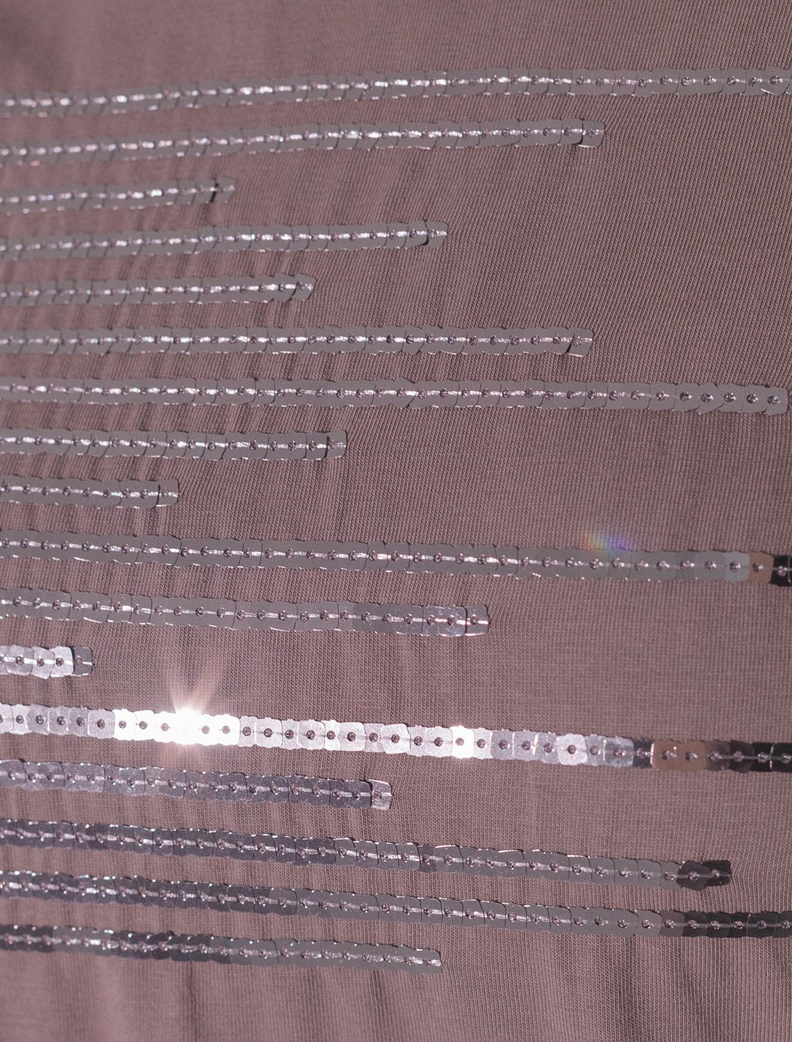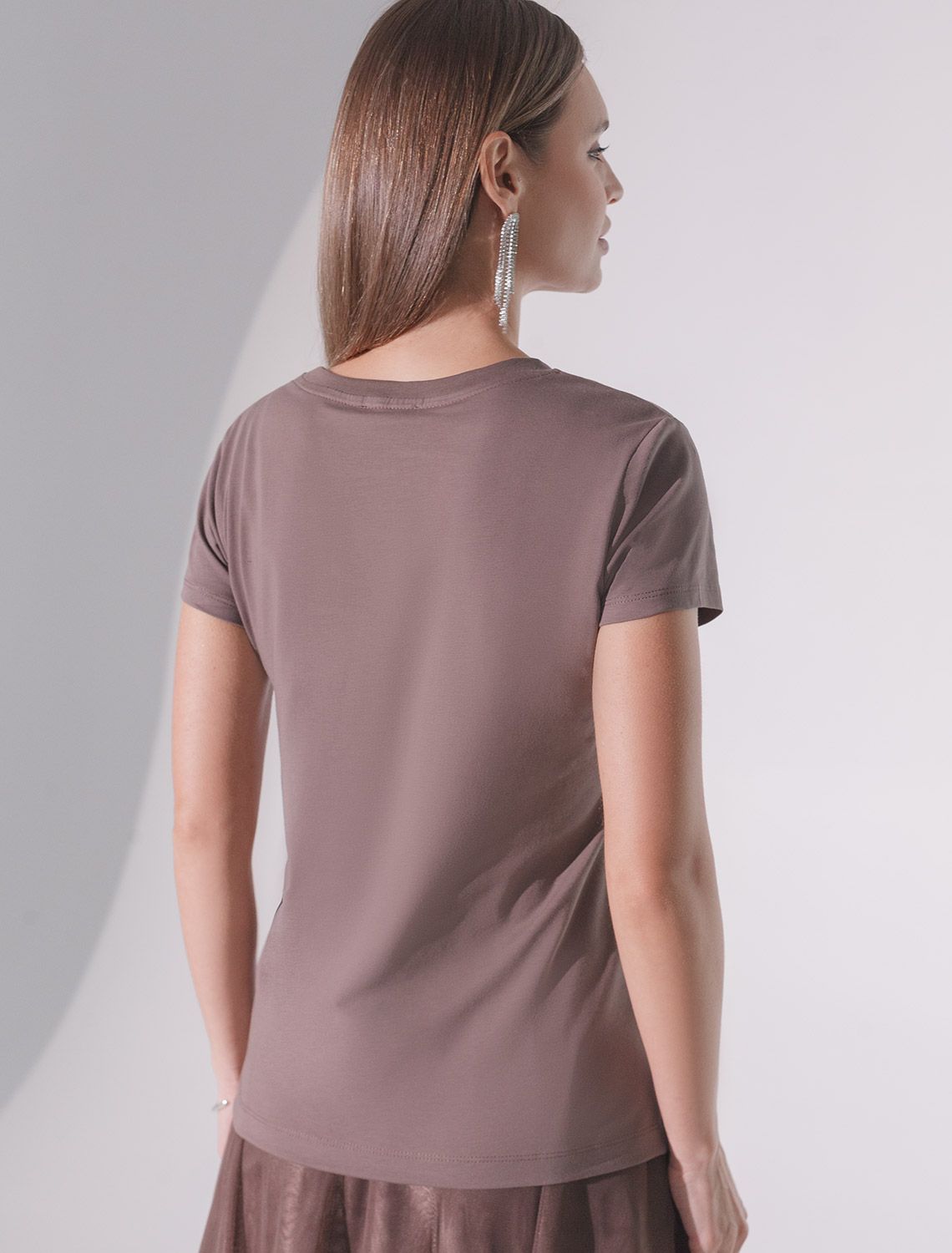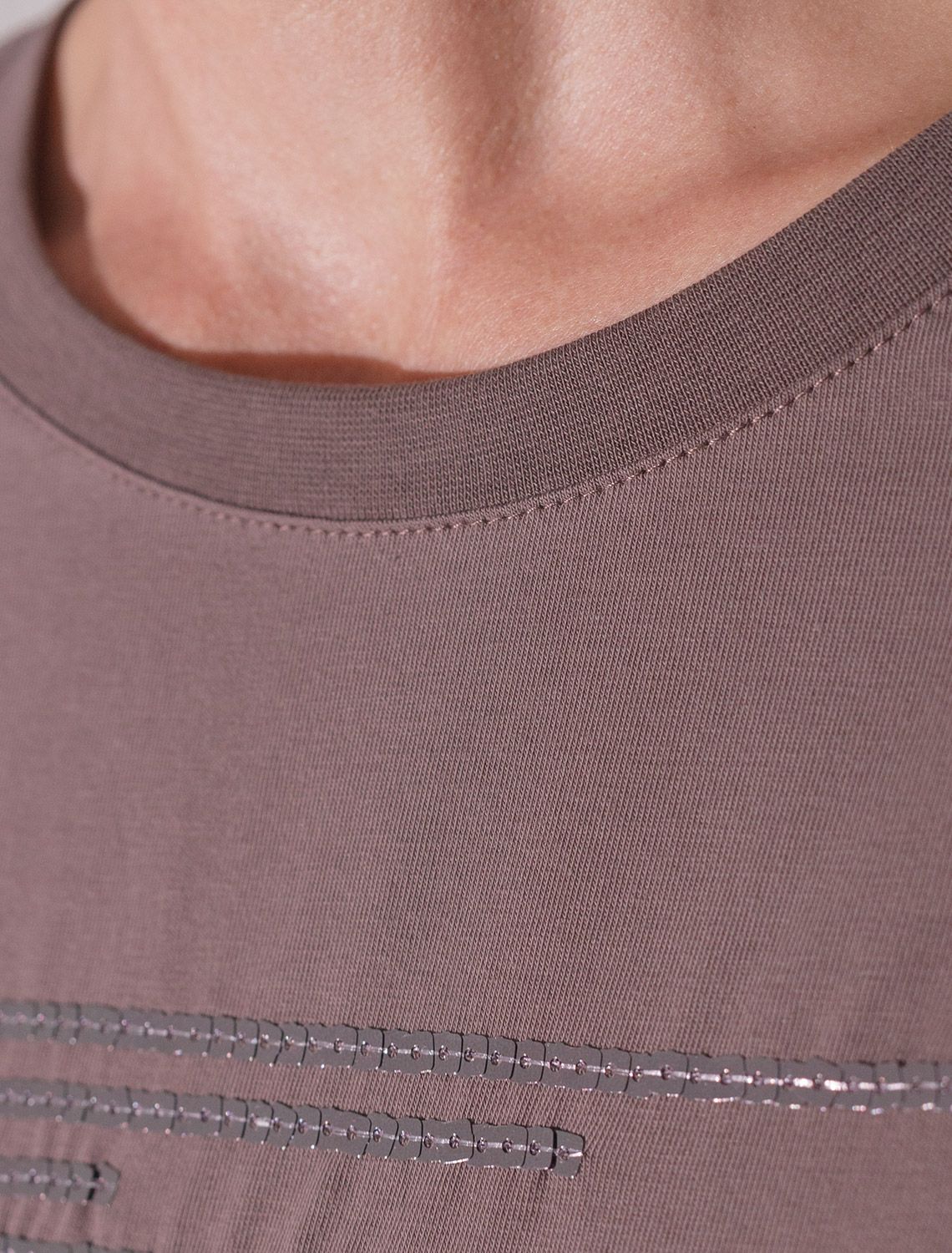 Футболка кофейного цвета идеально подходит для вечеринки и создания яркого образа. Оригинальный принт из пайеток придает изделию шикарный вид, который привлечет внимание на любом мероприятии. Модель с круглым вырезом и классическим коротким рукавом обеспечивает свободу движений и комфорт в носке. Такой фасон изделия подходит на большие размеры, гармонично сидит на фигуре и помогает создать легкий акцент на достоинствах. Аккуратный круглый вырез красиво подчеркивает шею и делает образ элегантным, сохраняя актуальность для разных случаев — от рабочих встреч до вечерних прогулок и праздничных мероприятий.