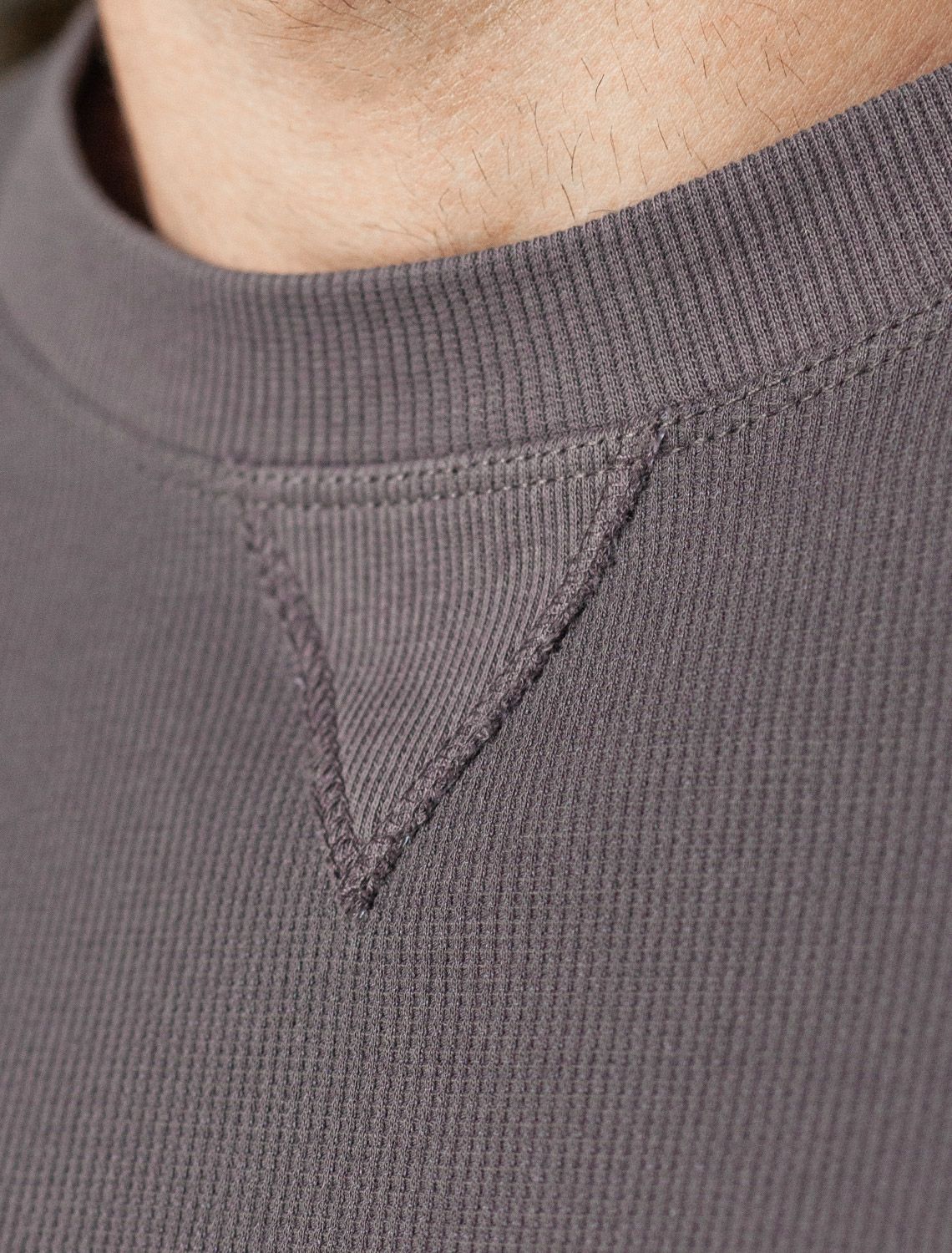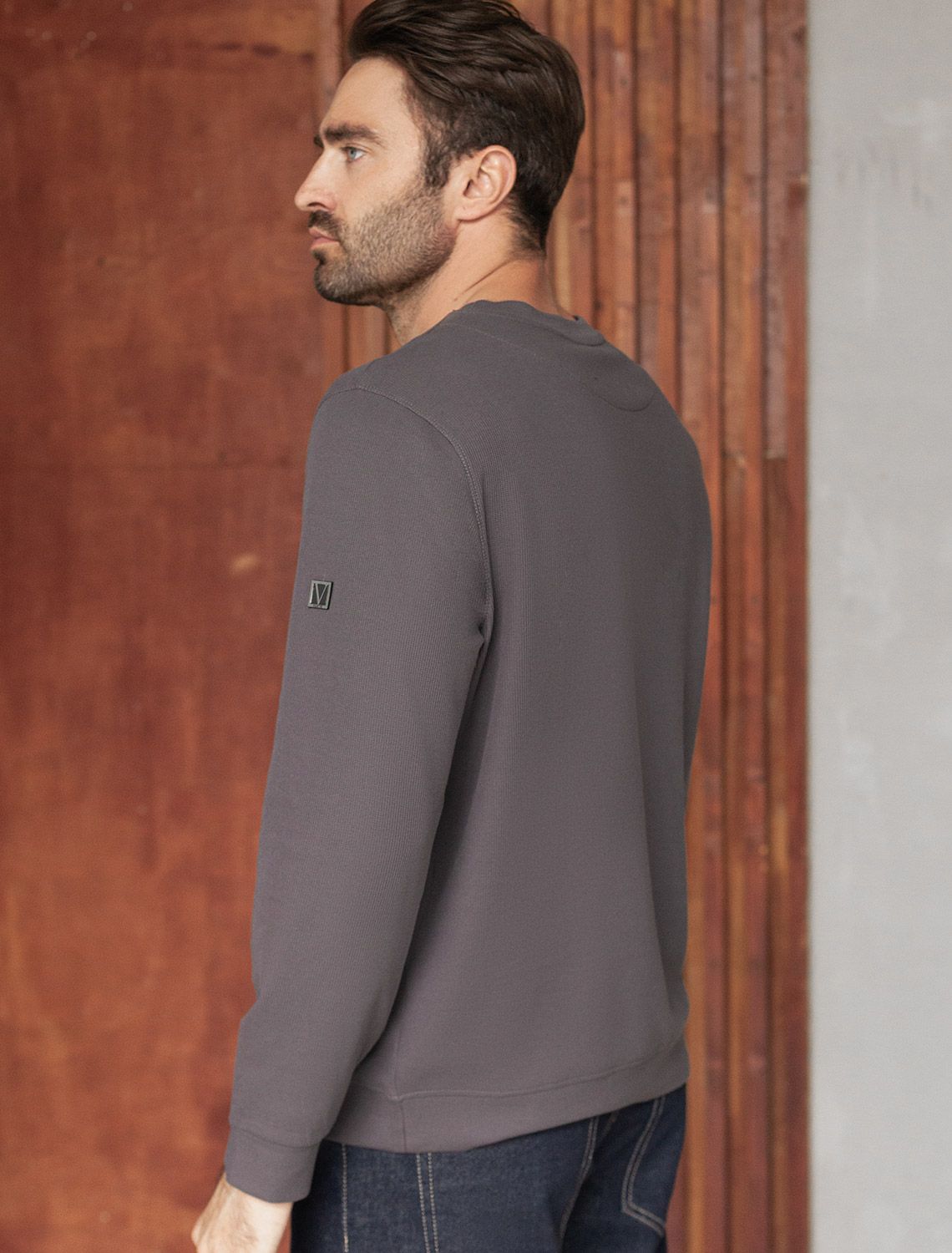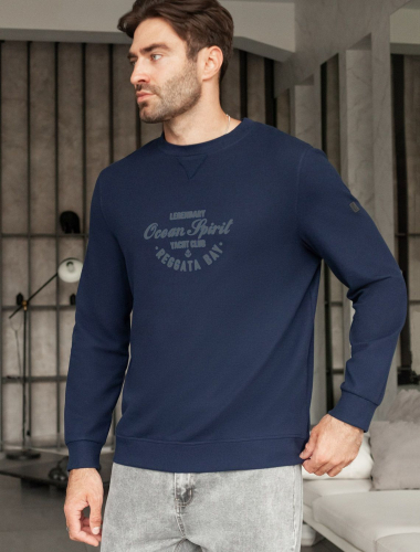 Легкий и невероятно комфортный джемпер серого цвета создан для повседневного образа. Мягкий фактурный эластичный трикотаж приятно ощущается на теле, не сковывает движения и отлично подходит для носки в любое время года. Полуприлегающий крой обеспечивает свободу и удобство, позволяя выглядеть стильно и чувствовать себя уверенно каждый день. Круглый ворот украшен декоративной нашивкой в виде перевернутого треугольника, добавляющей оригинальности.. Манжеты на рукавах и по низу аккуратно оформлены, что придает завершенность внешнему виду и способствует сохранению формы джемпера после длительной носки и многочисленных стирок. Принт в виде небольшой надписи добавляет яркости, подчеркивая индивидуальность каждого мужчины. Перевод надписи: Уour only limit is your mind - Твой единственный предел — твой разум.