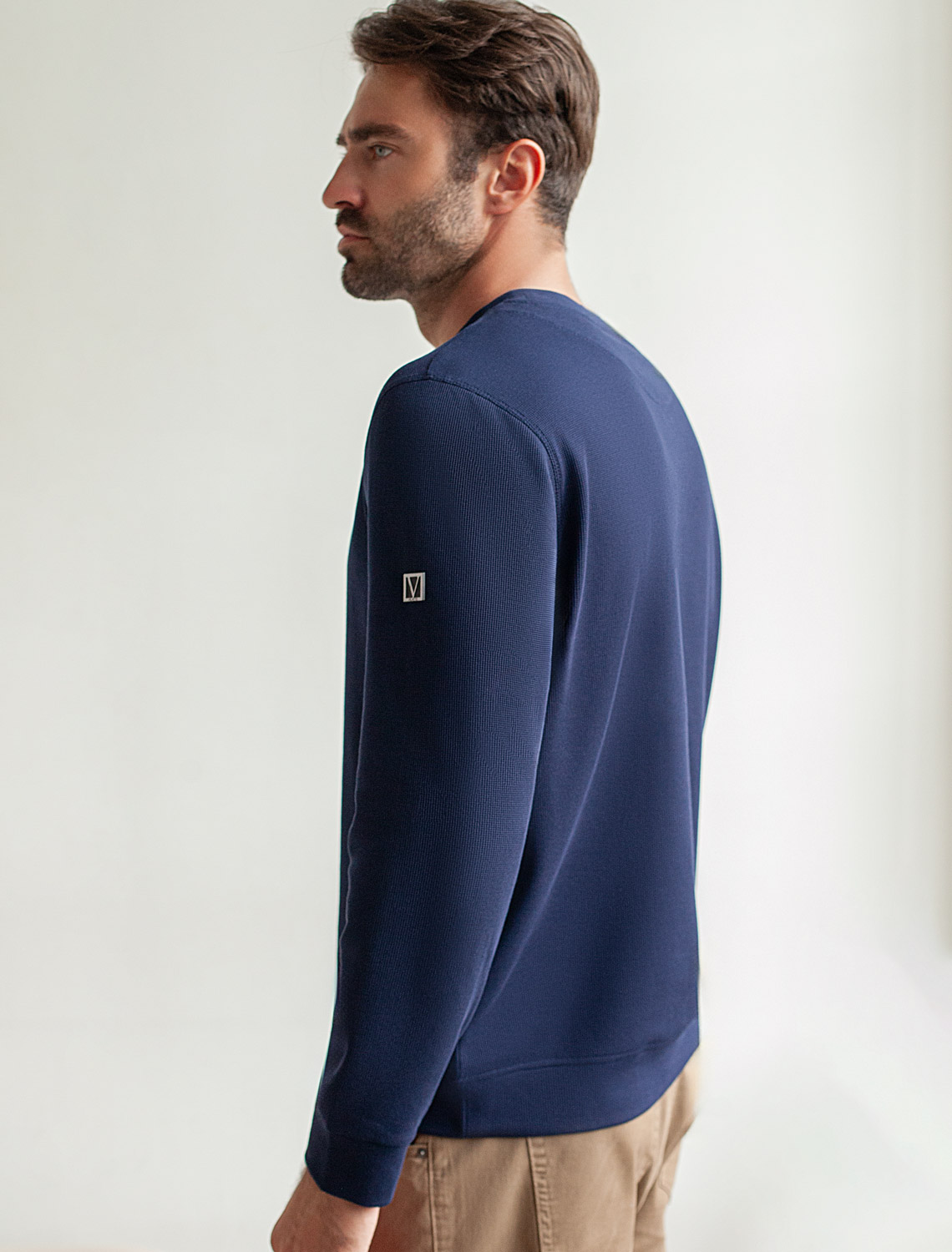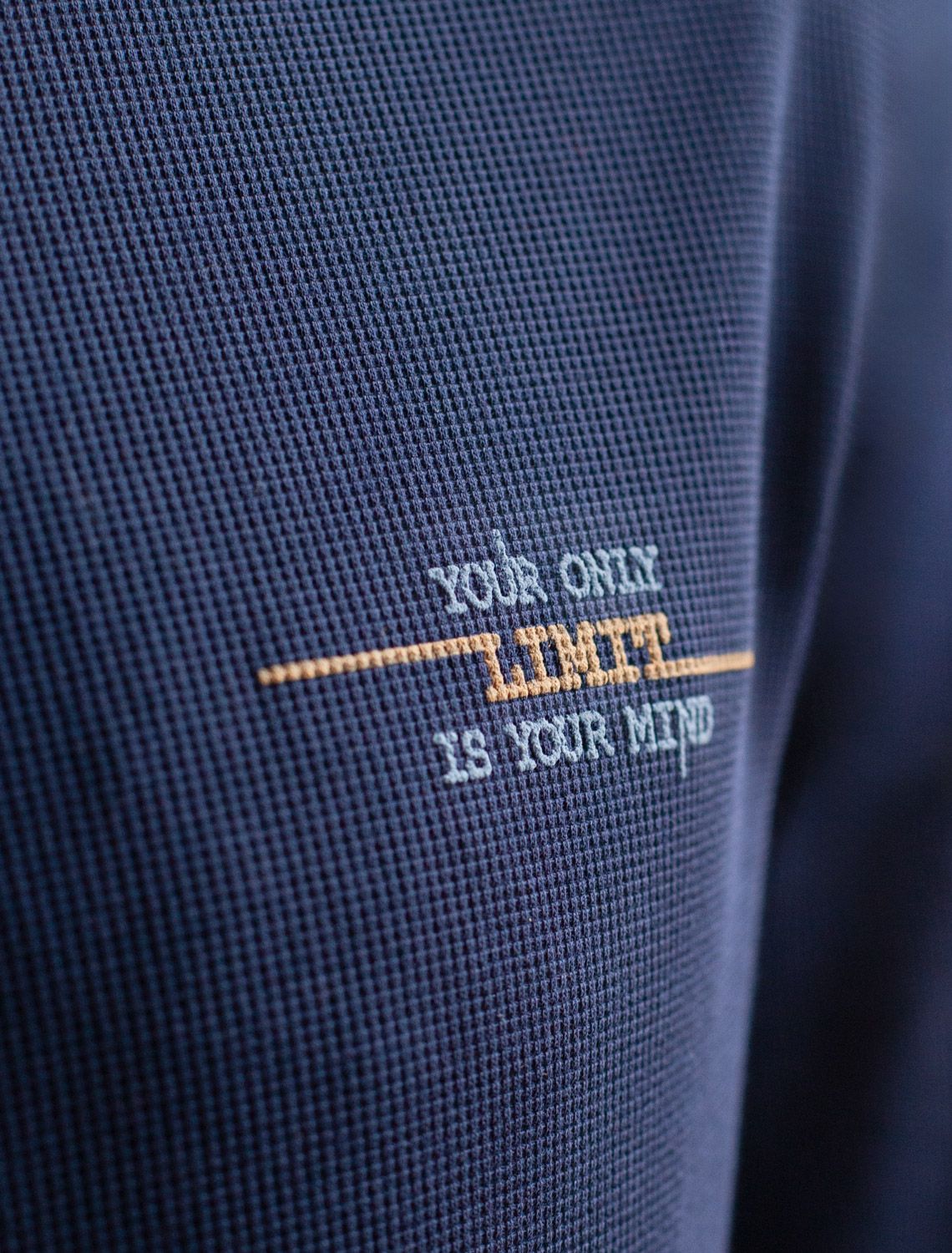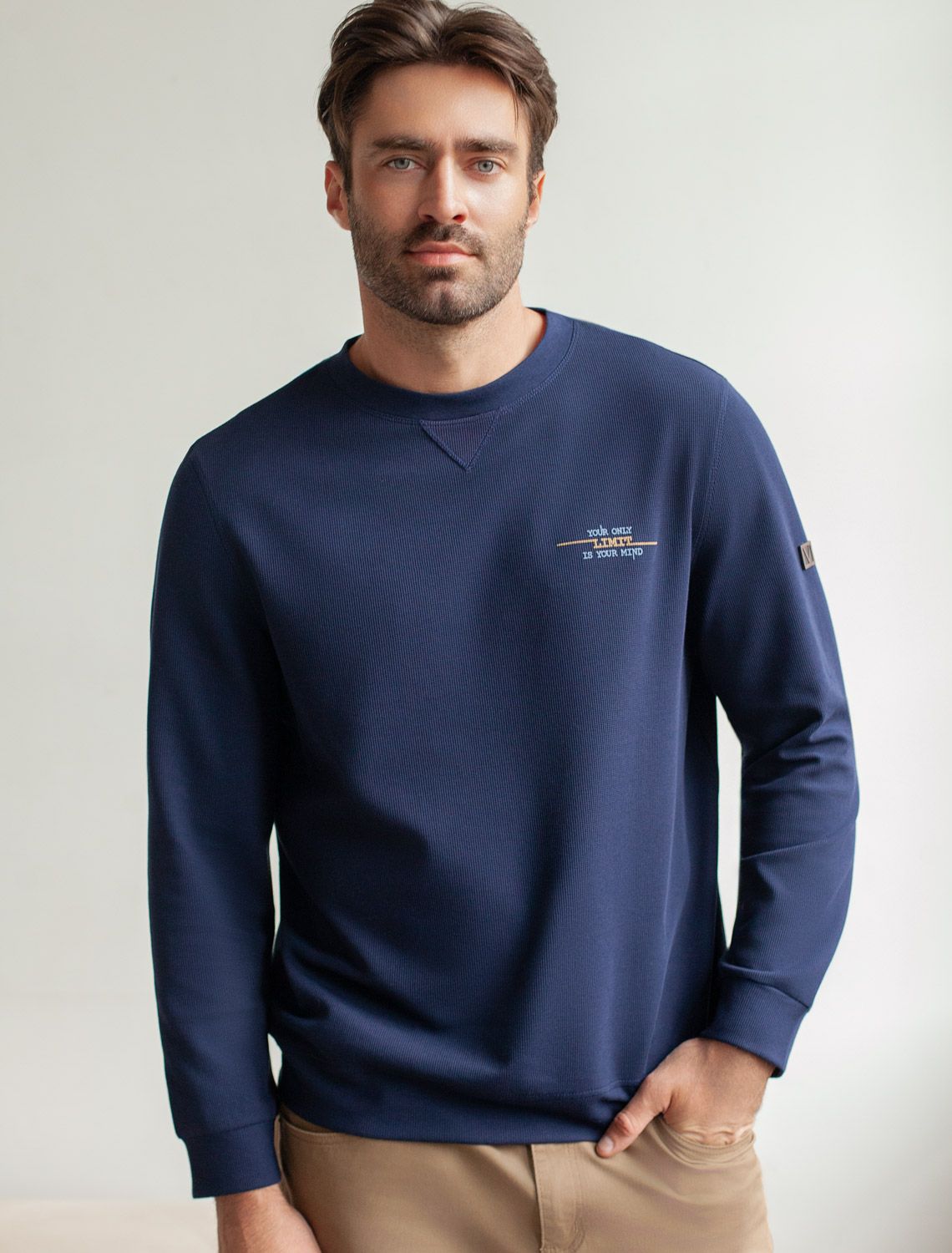 Легкий и невероятно комфортный джемпер светло-синего цвета создан для повседневного образа. Мягкий фактурный эластичный трикотаж приятно ощущается на теле, не сковывает движения и отлично подходит для носки в любое время года. Полуприлегающий крой обеспечивает свободу и удобство, позволяя выглядеть стильно и чувствовать себя уверенно каждый день. Круглый ворот украшен декоративной нашивкой в виде перевернутого треугольника, добавляющей оригинальности.. Манжеты на рукавах и по низу аккуратно оформлены, что придает завершенность внешнему виду и способствует сохранению формы джемпера после длительной носки и многочисленных стирок. Принт в виде небольшой надписи добавляет яркости, подчеркивая индивидуальность каждого мужчины. Перевод надписи: Уour only limit is your mind - Твой единственный предел — твой разум.