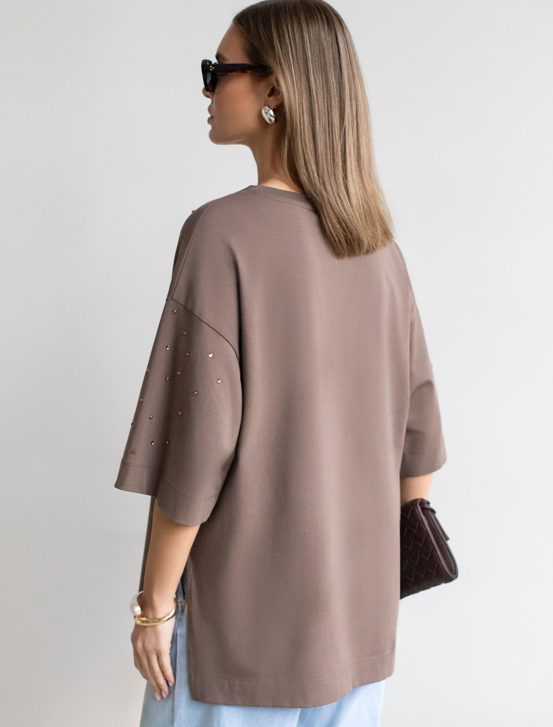 Оверсайз футболка кофейного цвета из премиального хлопка с добавлением эластана создана для комфорта и стиля каждый день. Натуральный материал приятный к телу, дышащая ткань хорошо держит форму и подходит для повседневной носки дома, в офисе или на прогулке. Классический свободный крой, удлиненный прямой силуэт и свободная посадка делают эту базовую футболку универсальным решением для любой фигуры и роста, включая плюс сайз размеры и беременных девушек, отлично скроет животик. Широкие рукава держвт форму и подойдут на полные руки. Нарядная футболка украшена авторским принтом в виде россыпи страз в тон основного полотна, которые создают красивый мерцающий эффект. Такой акцент делает модель уместной как для особых случаев, так и для ежедневных образов.