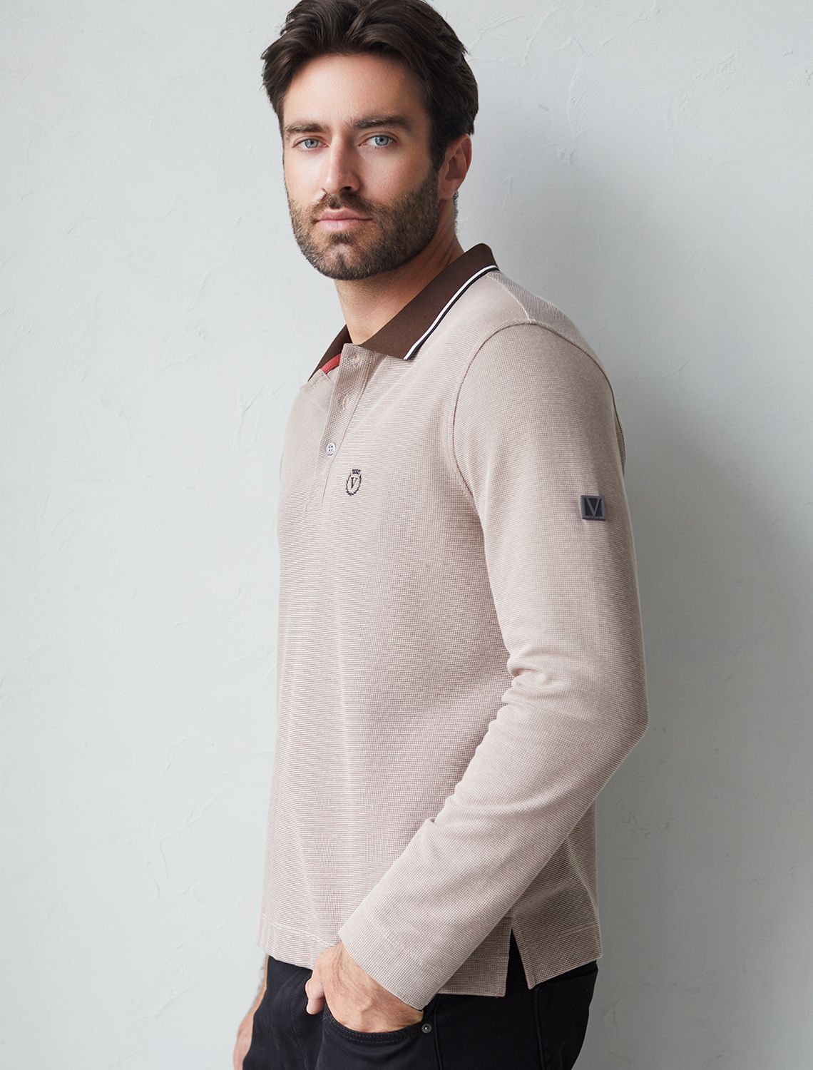 Стильный лонгслив коричневого цвета с плетеным воротником поло с застежкой на пуговицы выполнен из премиального хлопка в сочетании с эластаном .Невероятно мягкая ткань из натуральных волокон - она едва ощутима на коже и словно обнимает тело. Материал при касании кажется бархатистым, при движении он словно повторяет все мельчайшие линии фигуры. По свойствам материал сочетает в себе практичность и нежность: отлично провускает воздух, сохраняя ощущение свежести в течение всего дня, при этом созраняет тепло в прохладную погоду.Идеально подходит для чувствительной кожи, не вызывает раздражения и дискомфорта. Удобный отложной воротник делает образ современным и стильным, а длинные рукава с манжетами защищают руки при ветреной погоде.
