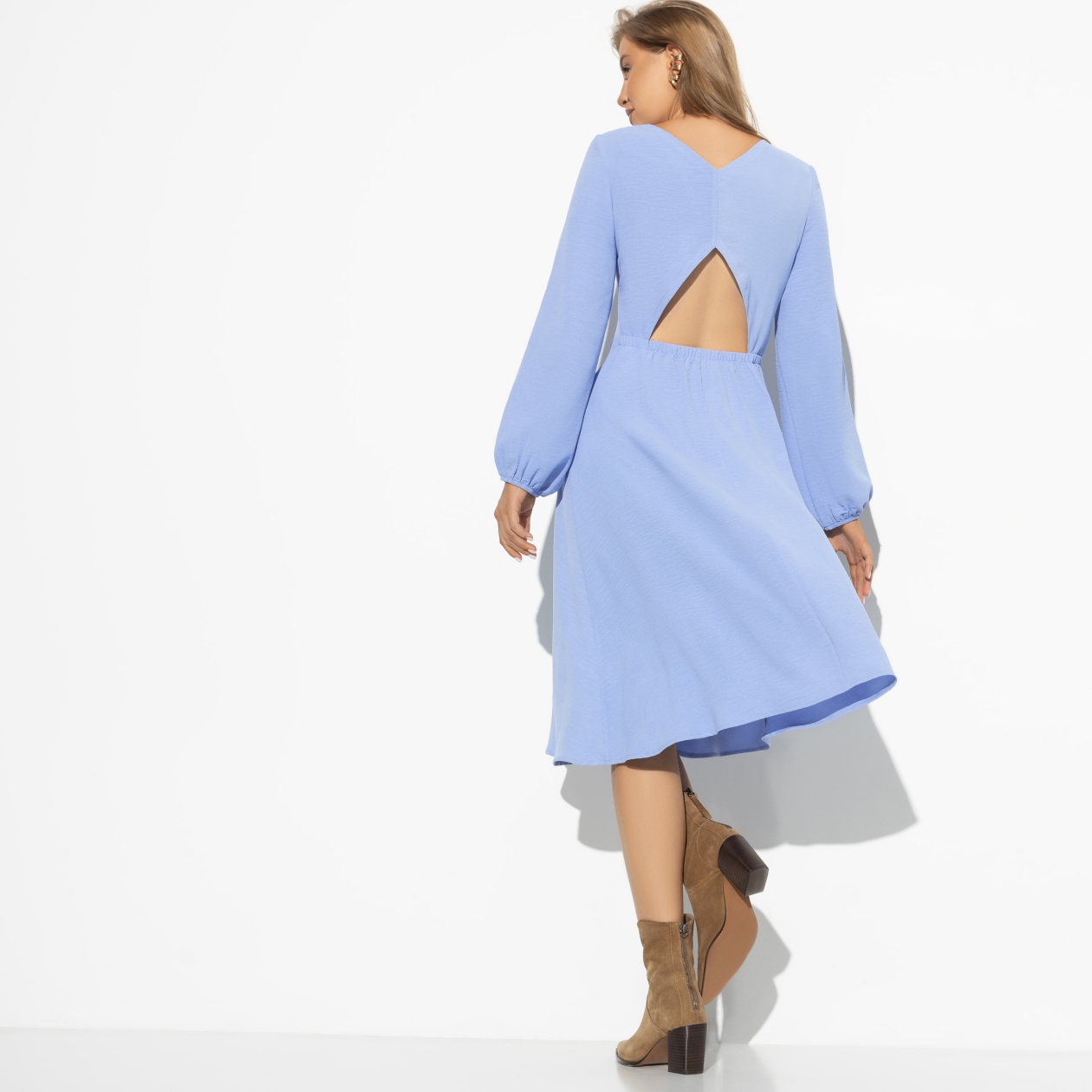 Особенностью этого платья является треугольный вырез на спине, который добавляет образу пикантности и стильного акцента. Такой дизайн позволяет выглядеть эффектно как на вечерних мероприятиях, так и в повседневной жизни. Талия на резинке обеспечивает удобную посадку и создаёт дополнительный комфорт при носке, делая платье идеальным для любого случая.