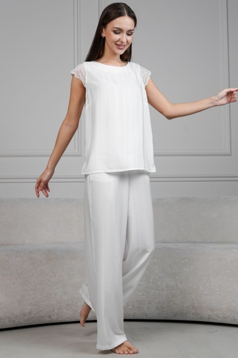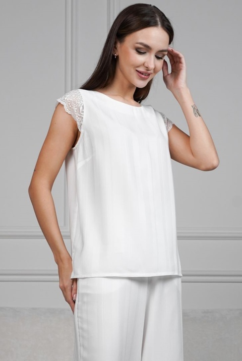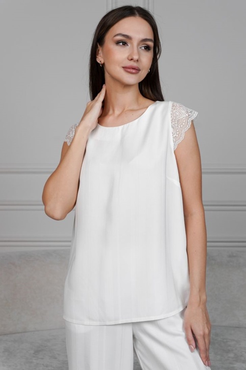 Топ свободного прилегания с круглым вырезом горловины. Короткий рукав декорирован нежным кружевом. Разрезы по низу в боковых швах.